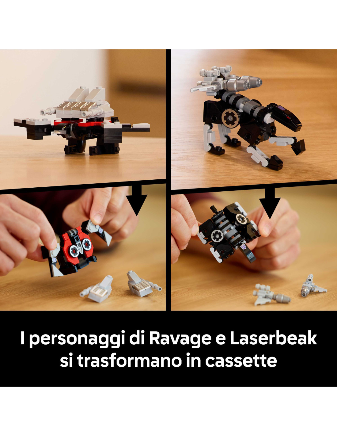 Crea un'esposizione accattivante o fai una sorpresa a una persona cara, con il kit di modellismo LEGO Icons Transformers: Soundwave (10358), un set progettato per gli adulti e per i fan dell'epica serie di film di fantascienza. Costruisci una dettagliata replica in mattoncini LEGO del robot Decepticon, insieme ai suoi fidati compagni Ravage e Laserbeak. Premendo il pulsante di riproduzione di Soundwave, è possibile attivare la voce e gli effetti sonori appositamente registrati. Il modellino da costruire di action figure Transformers è dotato di capsula a razzo, blaster laser e accessori per i dardi, oltre che di articolazioni mobili che gli consentono di trasformarsi da modalità registratore a cassette a robot LEGO Transformers, senza bisogno di essere smontato. Le figure di Ravage e Laserbeak si trasformano in modellini di cassette inseribili singolarmente nello slot del registratore a cassette di Soundwave. Questo set LEGO da collezione include anche una targhetta con le statistiche di potenza del personaggio, ed è un'ottima idea regalo per un uomo o una donna fan della serie.