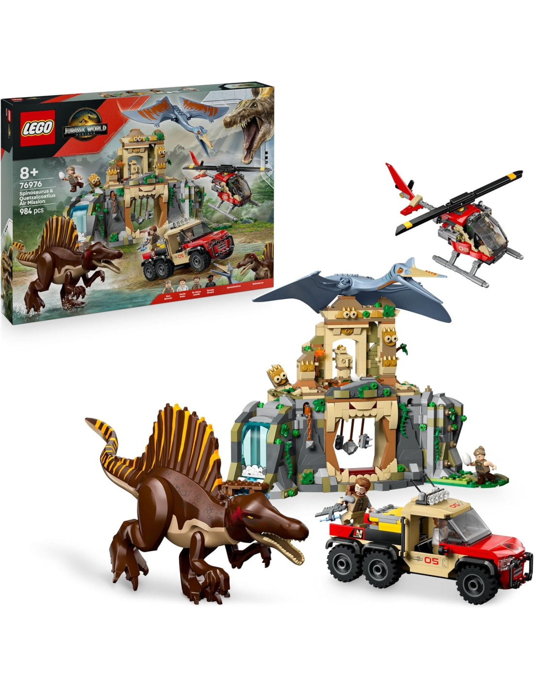 Giochi con dinosauri per bambini: regala ai giovani fan dei dinosauri LEGO Jurassic World il set Missione Aerea con Spinosauro e Quetzalcoatlus, un gioco di ruolo per bambini e bambine da 8 anni in su, ricco di opzioni, personaggi e veicoli LEGO Funzioni da scoprire: i dinosauri giocattolo hanno arti e mascelle mobili, i pilastri del tempio collassano, la cascata si apre e, tirando la catena sulla parete del tempio, si attiva una trappola