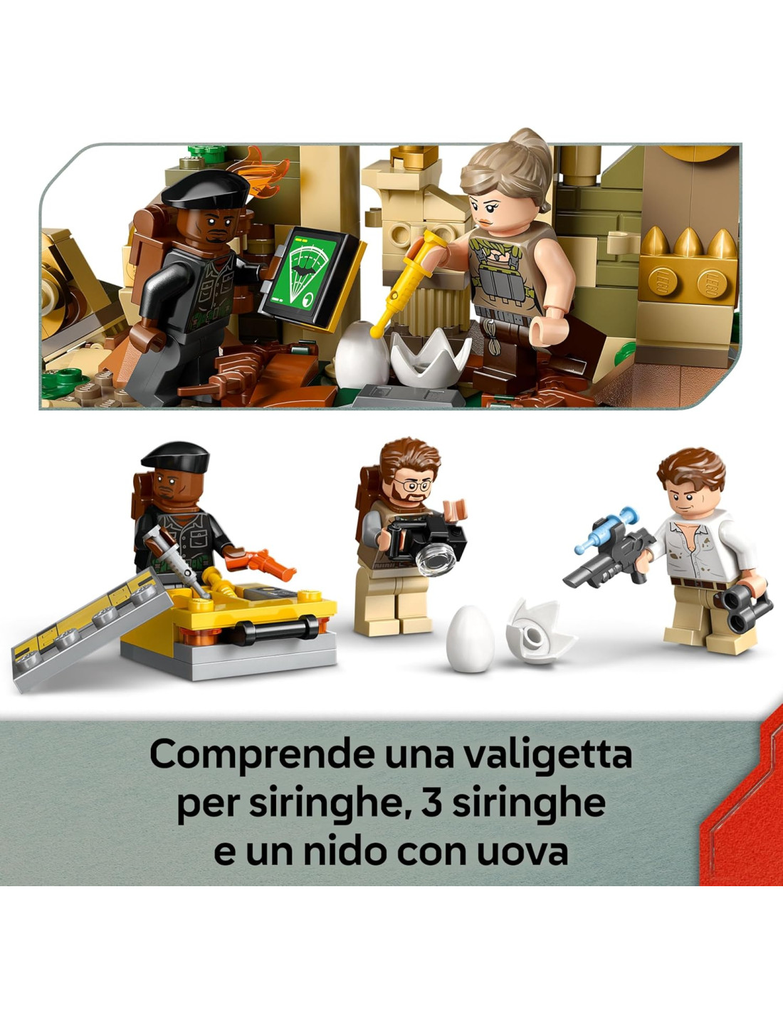Scena interattiva: questo kit da costruzione con dinosauri LEGO Jurassic World include un tempio con nido e uova, una parete da arrampicata, una cascata e 2 ingressi, una valigetta per le siringhe, 3 siringhe, un binocolo e una macchina fotografica