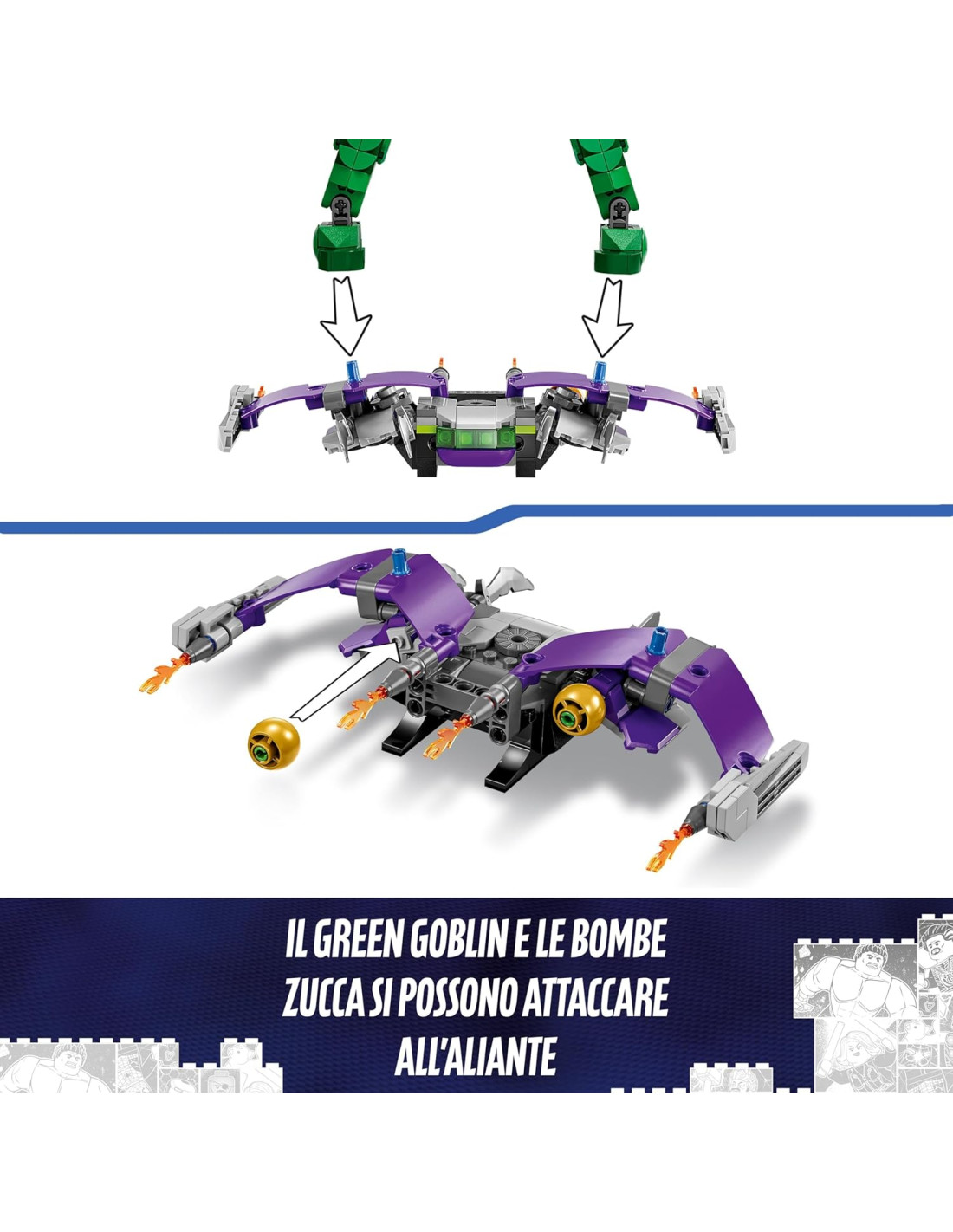 Gioco d'azione da costruire del super cattivo nemico di Spider-Man: il set LEGO Marvel del Personaggio Costruibile di Goblin, permette ai bambini e alle bambine da 8 anni in su di vivere tutta l'azione dei supereroi Marvel Action figure Marvel costruibile: le articolazioni mobili di spalle, braccia, anche e gambe del Green Goblin consentono ai bambini di creare fantastiche pose, con il personaggio impegnato in scontri ed emozionanti avventure Accessori autentici: l'action figure del Green Goblin può agganciarsi al suo aliante e tenere in mano 2 bombe-zucca, che possono essere inserite anche nello spazio sul retro del velivolo Tanti modi di giocare: questo gioco da costruire per bambini del cattivo Marvel, è ottimo per i giovani amanti dei supereroi che potranno collezionarlo ed esporlo a loro piacimento nella camera da letto Regalo per gli amanti dei film Marvel: questo set è un divertente regalo di compleanno per i bambini fan dell'azione dei supereroi e dei personaggi dell'universo di Spider-Man Aumenta il divertimento e i giochi d'avventura: scopri altri set con personaggi e supereroi costruibili della serie LEGO Marvel (disponibili separatamente), da collezionare