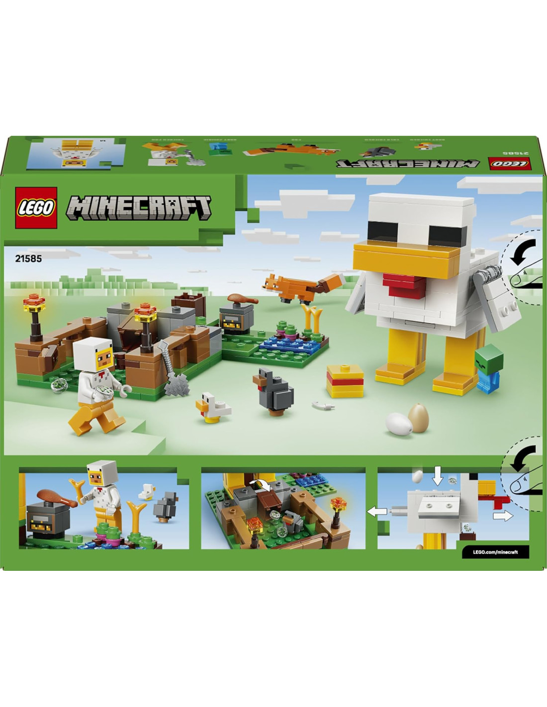 MOB E PERSONAGGI LEGO MINECRAFT: include una minifigure di un Chicken Fan, una figura di baby zombie (a cui piace cavalcare il pollo), una volpe, un Cold Chicken e un Pulcino