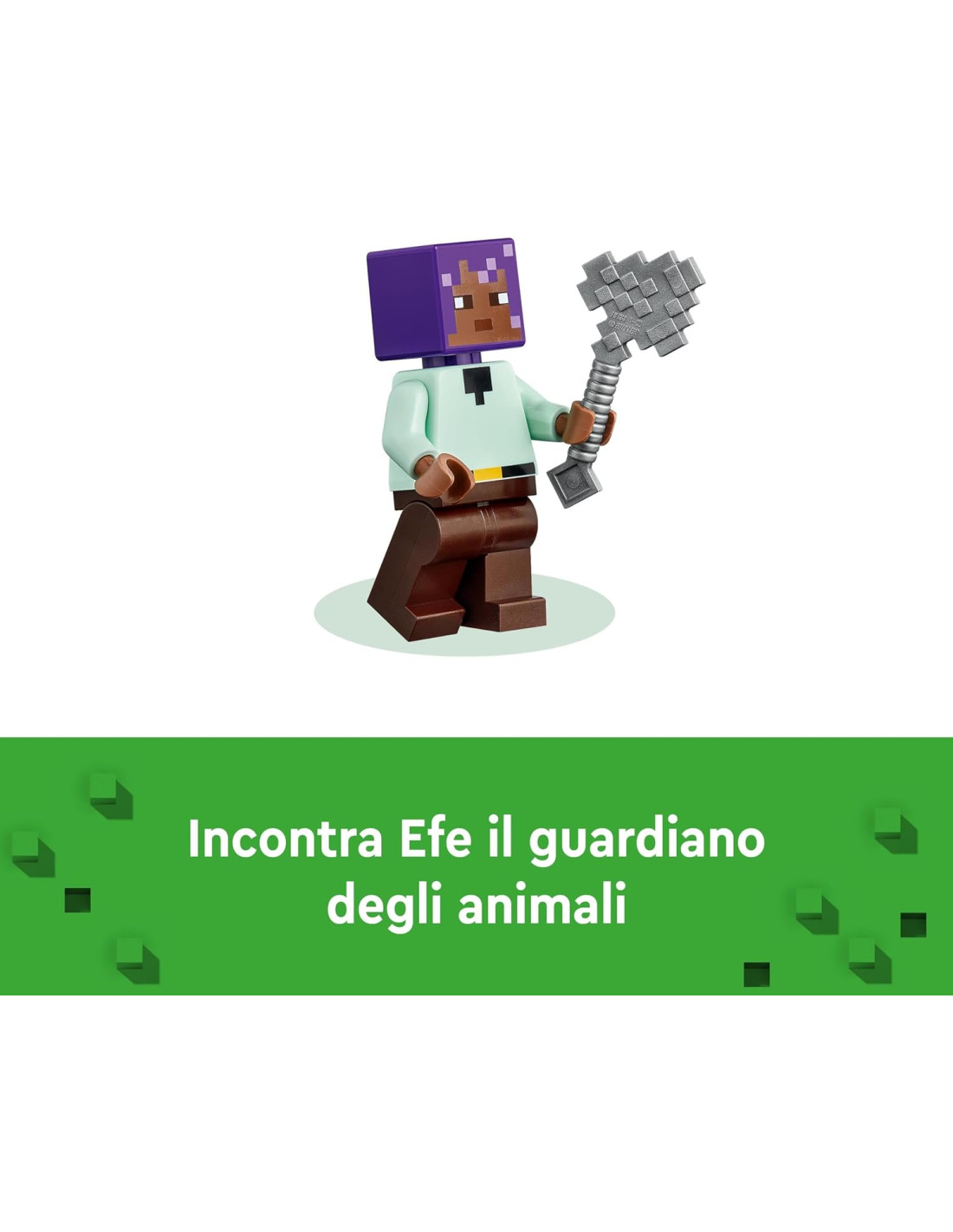 Il Santuario degli Animali LEGO Minecraft è una versatile idea regalo in mattoncini per gamer e bambini. Il giocattolo include 6 animali Minecraft di cui i bambini e le bambine di 7+ anni possono prendersi cura, e la prima apparizione del personaggio di Efe LEGO Minecraft per il gioco di ruolo e l'azione. Questo set con animali del bioma delle pianure contiene 3 aree: uno spazio di gioco recintato con un cancello e una stanza con una cassa piena di cibo per gli animali, tra cui un osso, una carota e del grano; un'area picnic con tavolo sotto un albero; e un tappeto su cui gli animali stanchi possono riposare. Oltre al custode degli animali, Efe, i baby mob del set includono un gatto Minecraft, una pecora magenta, un lupo, un coniglio, una mucca... e persino un Bimbo Zombie Minecraft. Questo set di costruzione LEGO Minecraft per bambini è un'idea regalo per i gamer, i bambini e gli amanti degli animali. Incoraggia il gioco di ruolo indipendente e si integra facilmente con altri giocattoli LEGO Minecraft (venduti separatamente). Per un ulteriore divertimento digitale, l'app LEGO Builder consente ai costruttori di ingrandire, ruotare i modelli in 3D e monitorare i loro progressi.