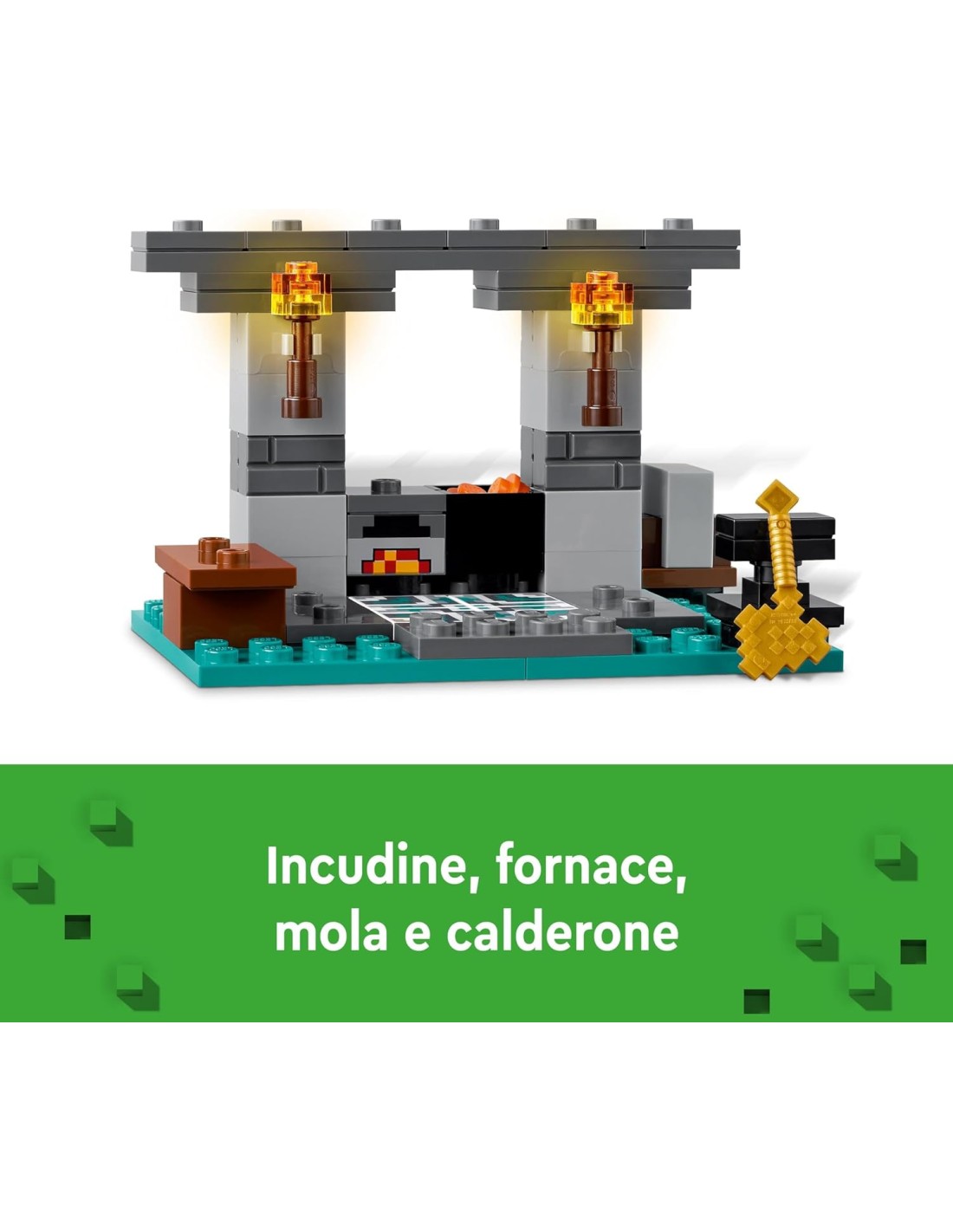 I giocatori di Minecraft dai 7 anni in su adoreranno provare le armi e le funzionalità de L'Armeria (21252). Questo kit di costruzione LEGO Minecraft è una fantastica idea regalo per i bambini e offre ai giocatori il punto di partenza perfetto per avventure creative con Minecraft. Questo giocattolo da gaming costruibile per i bambini include 2 personaggi familiari: l'eroe d'azione di Minecraft Alex, con il suo scudo e la spada di diamante, e l'operoso fabbro di armature. Sono presenti 3 ambienti da esplorare: l'area di lavoro, con incudine, fornace, mola e calderone pieno di lava; la sala delle armature, con il suo baule contenente un'ascia d'oro, un tridente incantato, una spada di netherite, uno scudo e altre risorse Minecraft; e il portale del Nether, con la sua porta d'ingresso alla prossima avventura dei giocatori. Questo giocattolo d'avventura Minecraft consente anche di ampliare il gioco di ruolo combinandolo facilmente con altri set LEGO Minecraft, in particolare Agguato nel portale del Nether (21255), venduto separatamente.