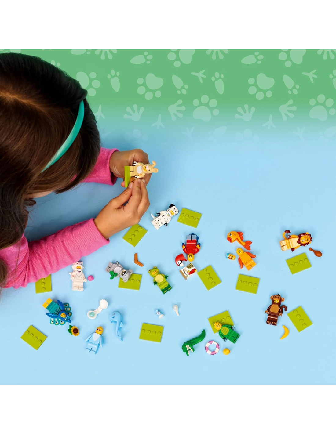1 DI 12 FIGURE DI ANIMALI LEGO: include figure in costume da leone, rana, coccodrillo, scimmia, koala, pappagallo, cane, adorabile coniglio, pesciolino d'oro, tenero gatto, pavone e delfino