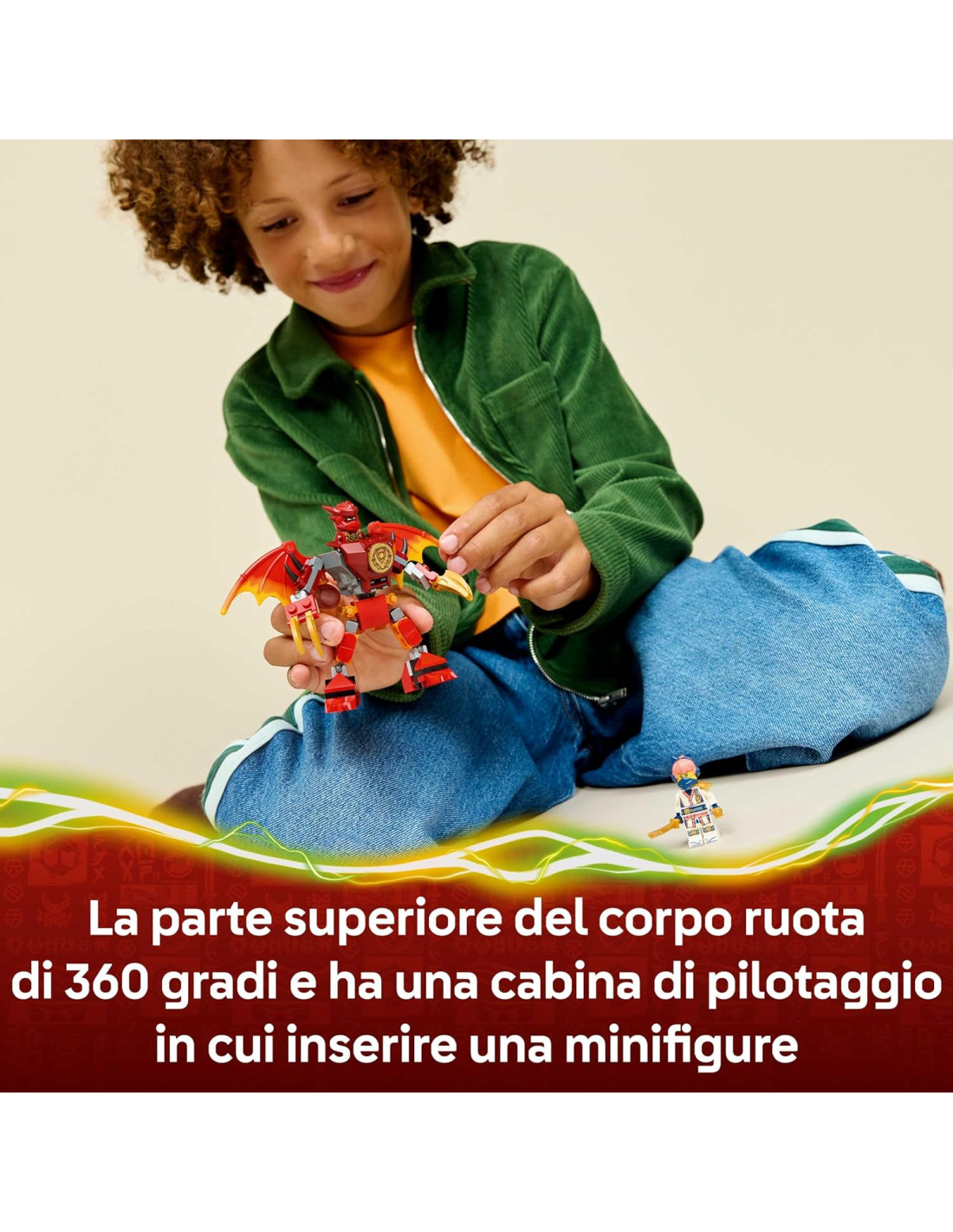 ACTION FIGURE SNODABILE: il mech NINJAGO in stile "drago giocattolo" ha gambe snodabili, grandi ali, mani artiglianti e la parte superiore del corpo che ruota di 360 gradi, oltre a un cockpit dove posizionare una minifigure