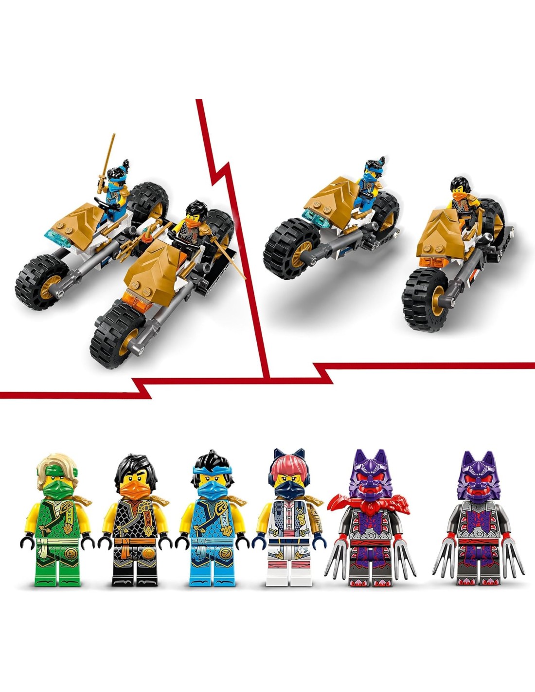 Questo set di giochi d'avventura 4 in 1 per bambini e bambine da 9 anni in su, il veicolo giocattolo da costruire del Cingolato del Team Ninja (71820) LEGO NINJAGO, permette di vivere avventure ricche d'azione della Stagione 2 del programma televisivo La rivolta dei draghi NINJAGO. I bambini possono giocare con il grande veicolo LEGO NINJAGO prima di separarlo in 4 macchine giocattolo più piccole: l'aliante di Sora con 2 shooter, il fuoristrada di Lloyd e le moto giocattolo di Cole e Nya. Questo set con eroi giocattolo include 6 minifigure dei personaggi LEGO NINJAGO di Sora, Lloyd, Nya e Cole, ognuno dotato di speciale armatura da torneo e armato di spada katana, insieme ai loro rivali in battaglia: un Guerriero Maschera del Lupo e un Generale Maschera del Lupo. Questo divertente set di giochi d'azione LEGO NINJAGO, è un'ottima idea regalo di compleanno per bambini e fan della serie, amanti dei giochi e delle costruzioni LEGO. La gamma di set LEGO NINJAGO e di giocattoli ninja, include draghi, veicoli e templi che offrono ai fan tante avventure con i loro eroi. Ogni playset d'avventura può essere creato con l'app LEGO Builder, una guida per un'esperienza di costruzione facile e intuitiva, con cui ingrandire e ruotare i modelli in 3D, salvare i set e monitorare i progressi fatti.