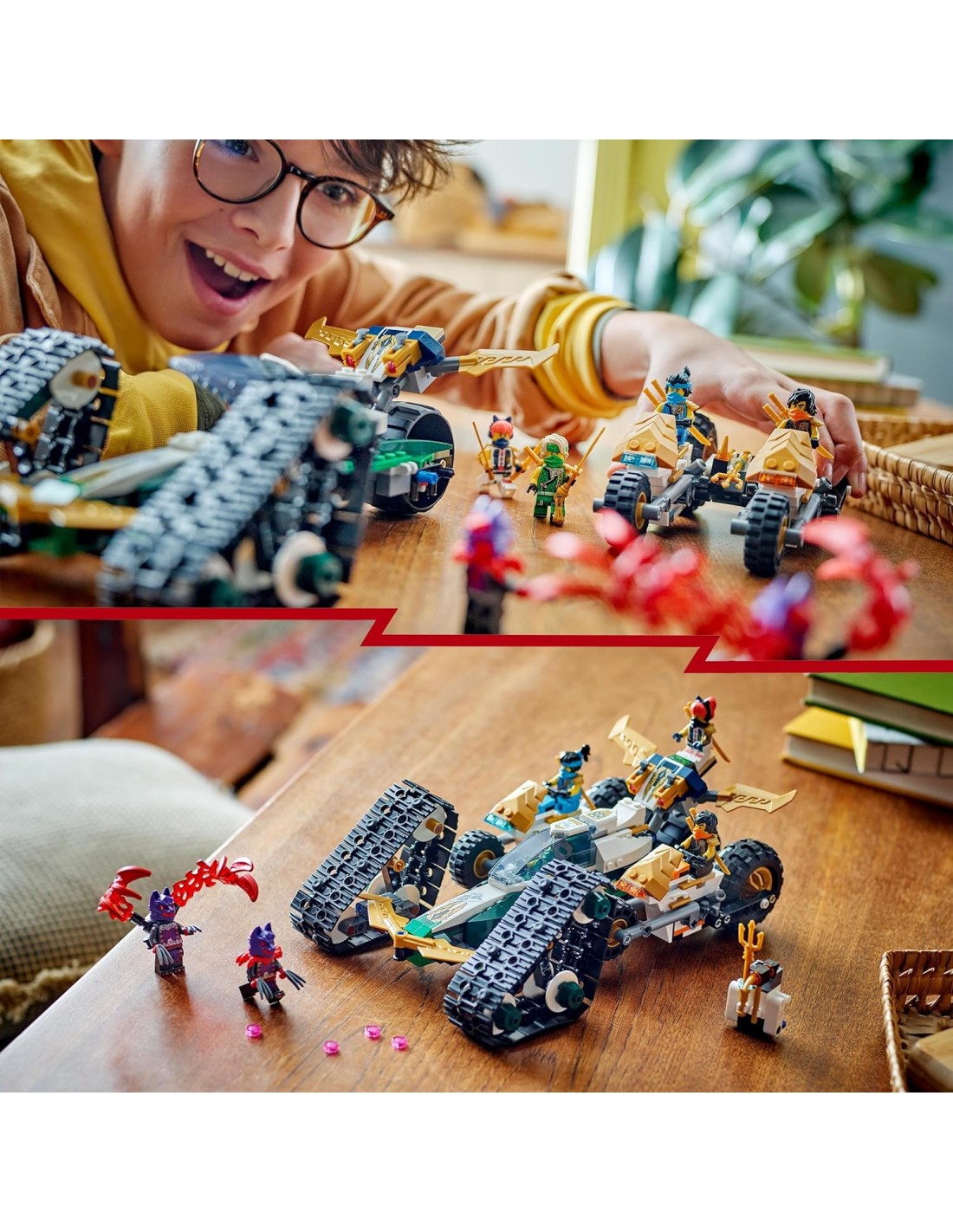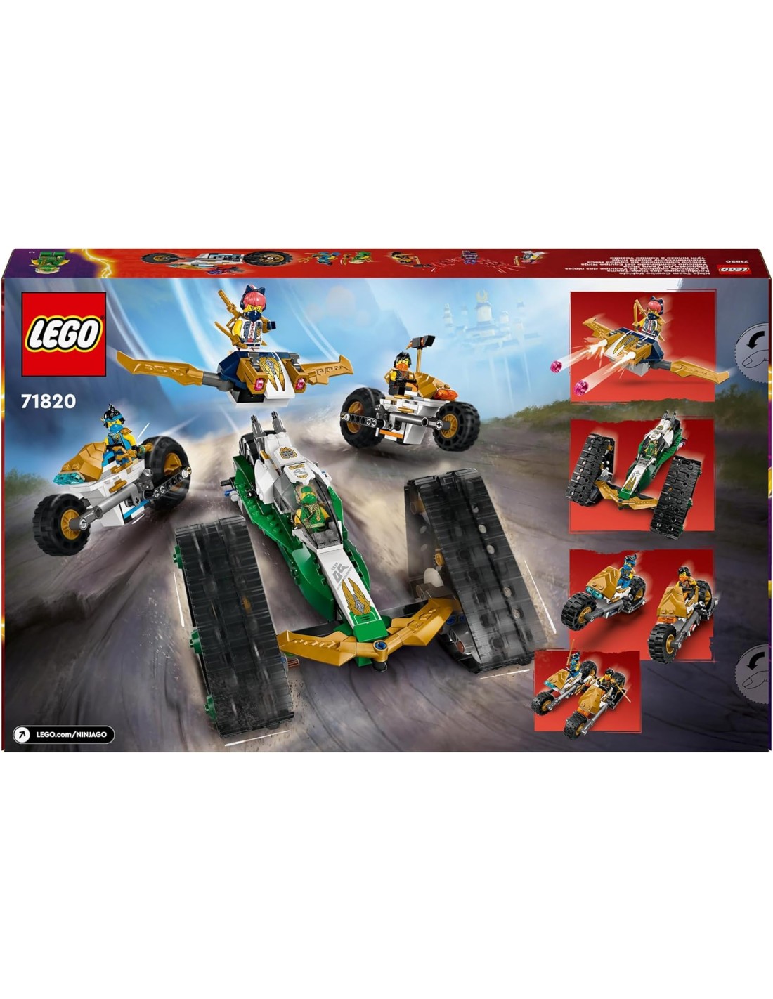 LEGO NINJAGO Cingolato del Team Ninja, Veicolo Giocattolo 4 in 1 con 2 Moto, Aliante e Macchina Fuoristrada da Costruire, Giochi d'Avventura per Bambini e Bambine da 9 Anni con 6 Minifigure 71820