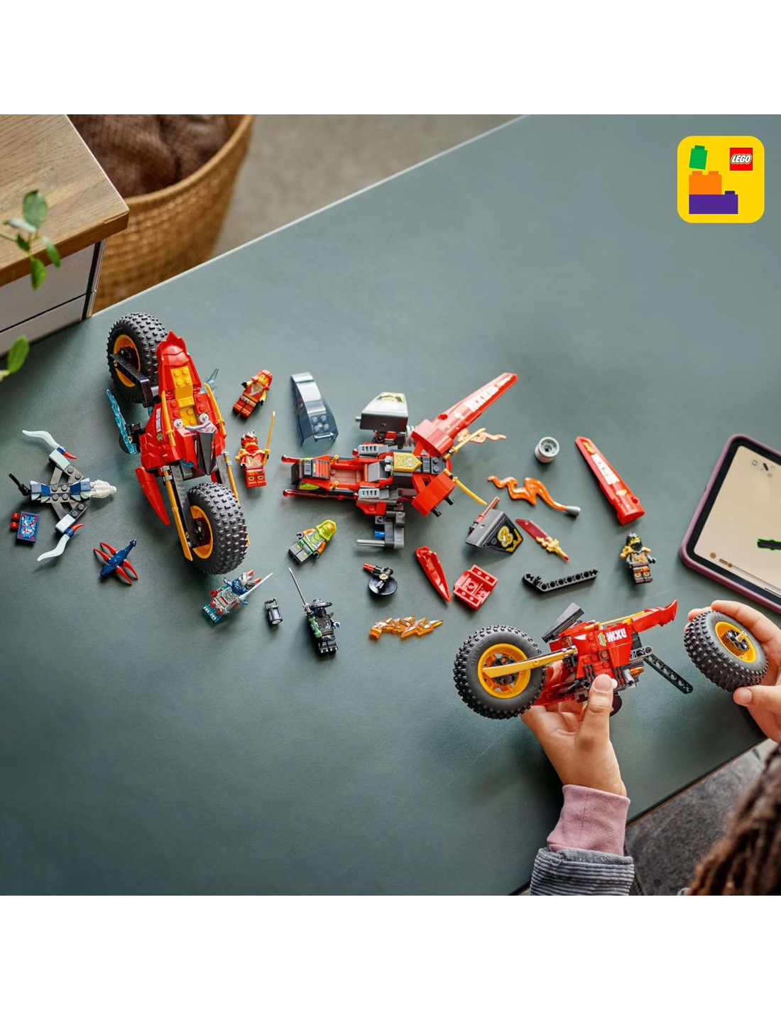 La rivolta dei draghi Veicoli giocattolo rimovibili: la grande moto LEGO NINJAGO può essere suddivisa in 3 mezzi: la moto giocattolo di Kai, la moto ninja di Wyldfyre e il jet aereo giocattolo di Frak, dotato di 2 shooter 6 minifigure LEGO di personaggi NINJAGO: Kai, Wyldfyre, Cole, Nokt, uno Scout dragoniano spettrale e, per la prima volta in assoluto, Frak; include anche un piccolo aliante giocattolo e un animaletto