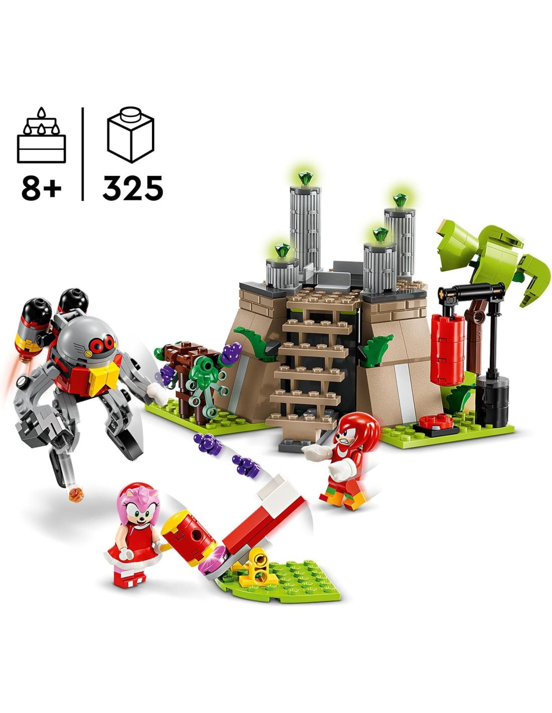 Rendi felici gli appassionati di videogiochi con il set Knuckles e il Santuario del Master Emerald (76998), un gioco LEGO Sonic per bambini e bambine da 8 anni in su da costruire, con cui dar vita a tante avventure da veri eroi. Questo giocattolo LEGO Sonic the Hedgehog da collezione, include un santuario con 4 Smeraldi del Caos, l'alloggi del personaggio giocattolo di Knuckles posizionato sotto il santuario, un'area di allenamento con pavimento rotante, una vite, il martello di Amy e una catapulta giocattolo per lanciare l'uva contro l'Eggrobo. Questo divertente regalo per i gamer comprende 4 personaggi LEGO Sonic: le figure di Knuckles e Amy, un Eggrobo Badnik snodabile con jetpack giocattolo e lancia-bottoncini, e un Picky. Questo set di giochi Sonic consente ai fan di creare storie con Knuckles e Amy: dall'allenamento e la raccolta dell'uva, alla difesa del santuario e dei Smeraldi del Caos, fino al relax con spuntini dopo aver sconfitto l'Eggrobo e salvato il Picky. Il divertimento superveloce sposa il gioco indipendente con le costruzioni LEGO Sonic the Hedgehog. I bambini vivono un'avventura di costruzione intuitiva con l'app LEGO Builder, dove possono ingrandire e ruotare i modelli, salvare set e monitorare i progressi.