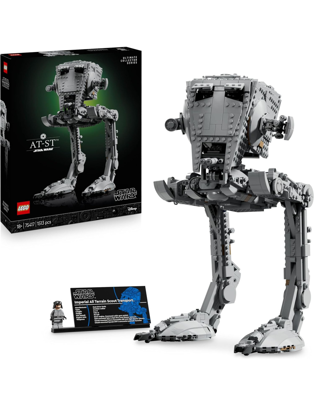 Decorazione per la casa o l'ufficio: esponi la tua creazione accanto alla targhetta informativa dell'AT-ST e alla minifigure del pilota AT-ST LEGO Star Wars, dotato di stemma imperiale sulle braccia e di pistola blaster