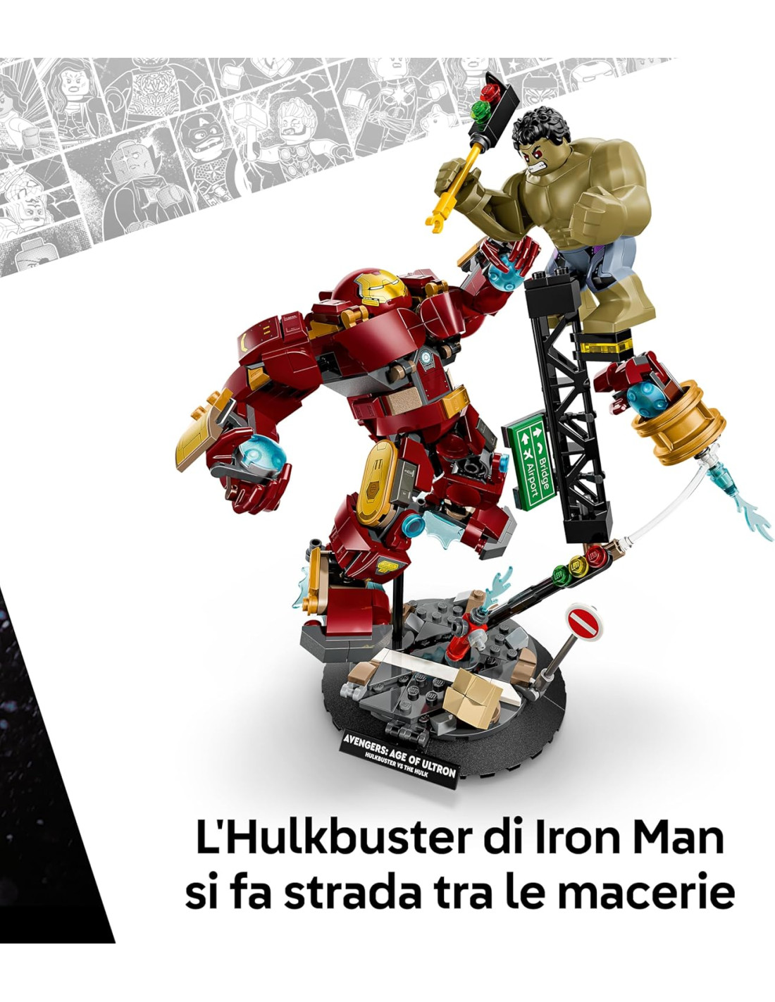 GIOCATTOLO LEGO | MARVEL CON ACCESSORI: il set è ambientato in una strada piena di detriti, con strutture in acciaio crollate e un semaforo in mattoncini che Hulk può usare come arma