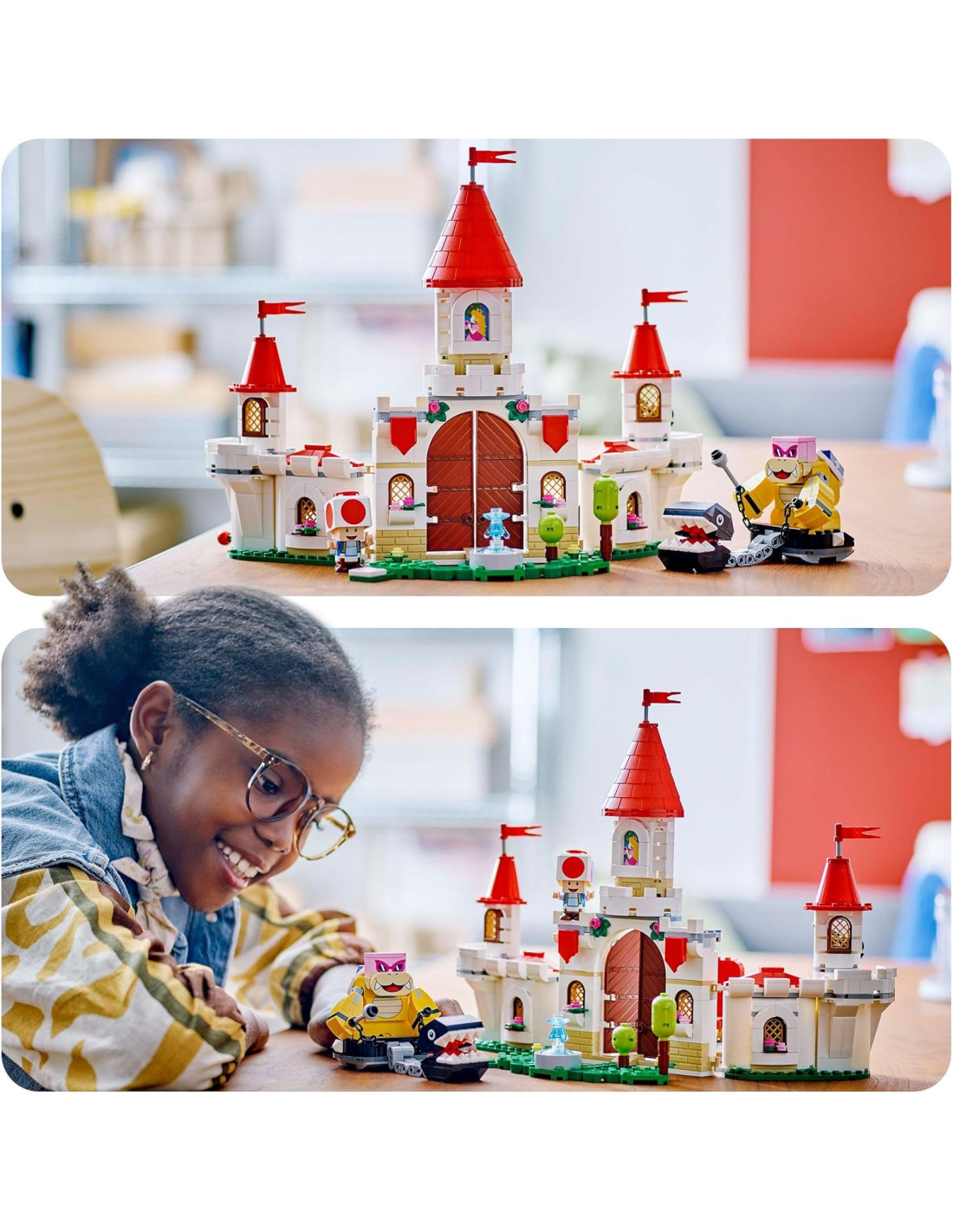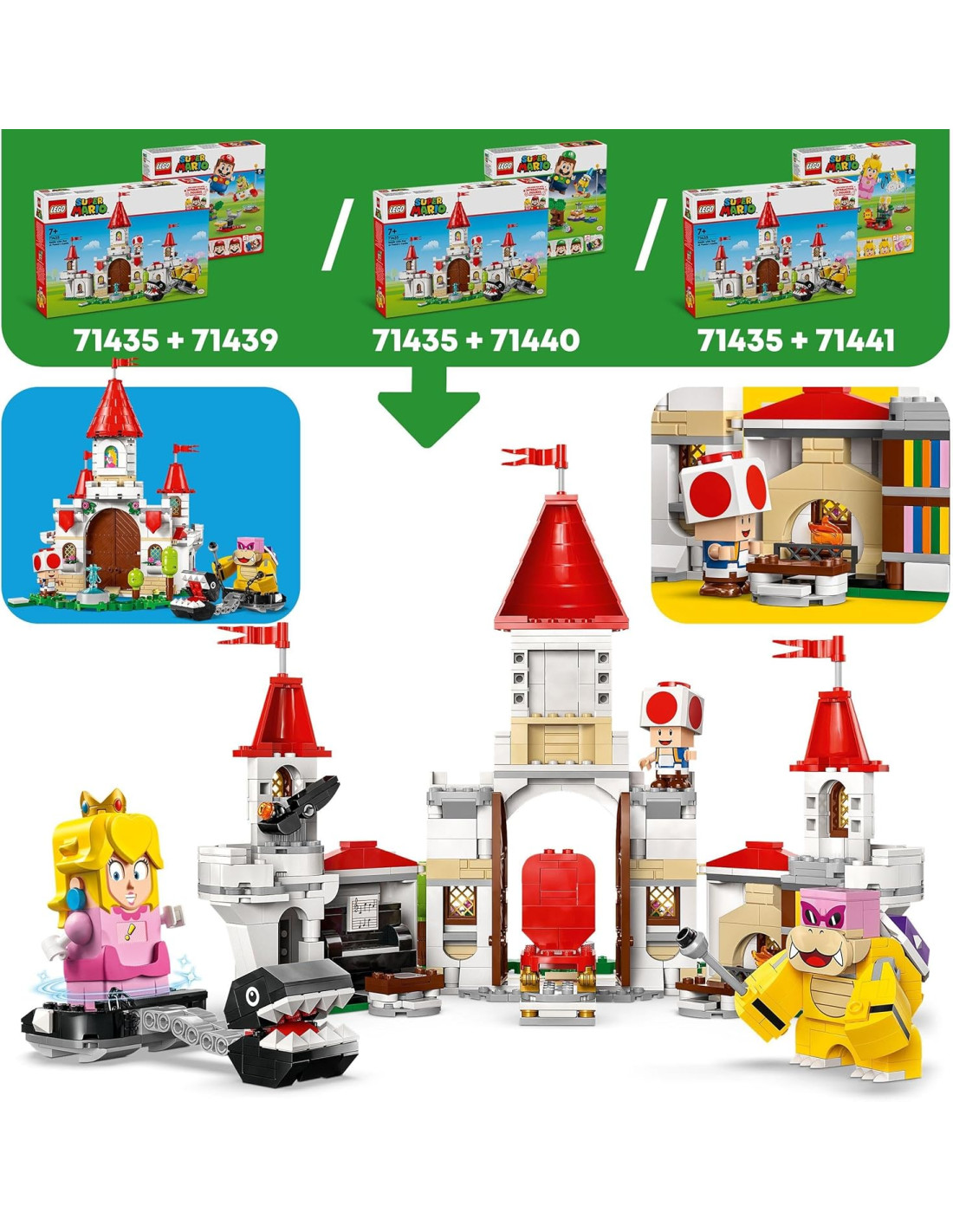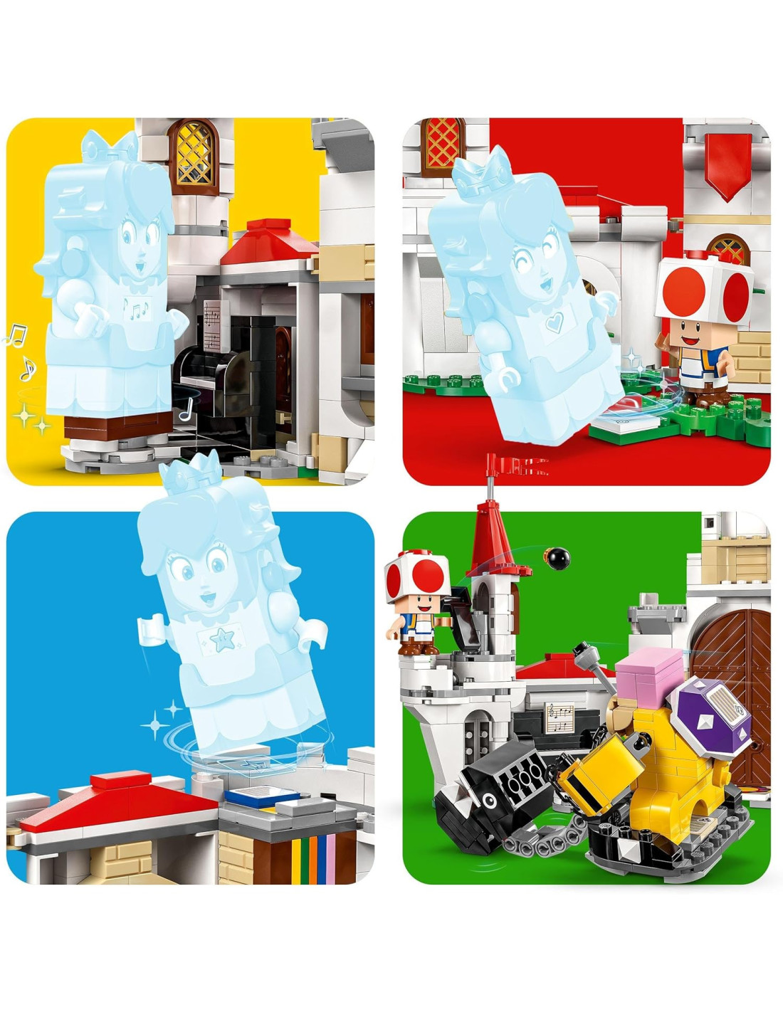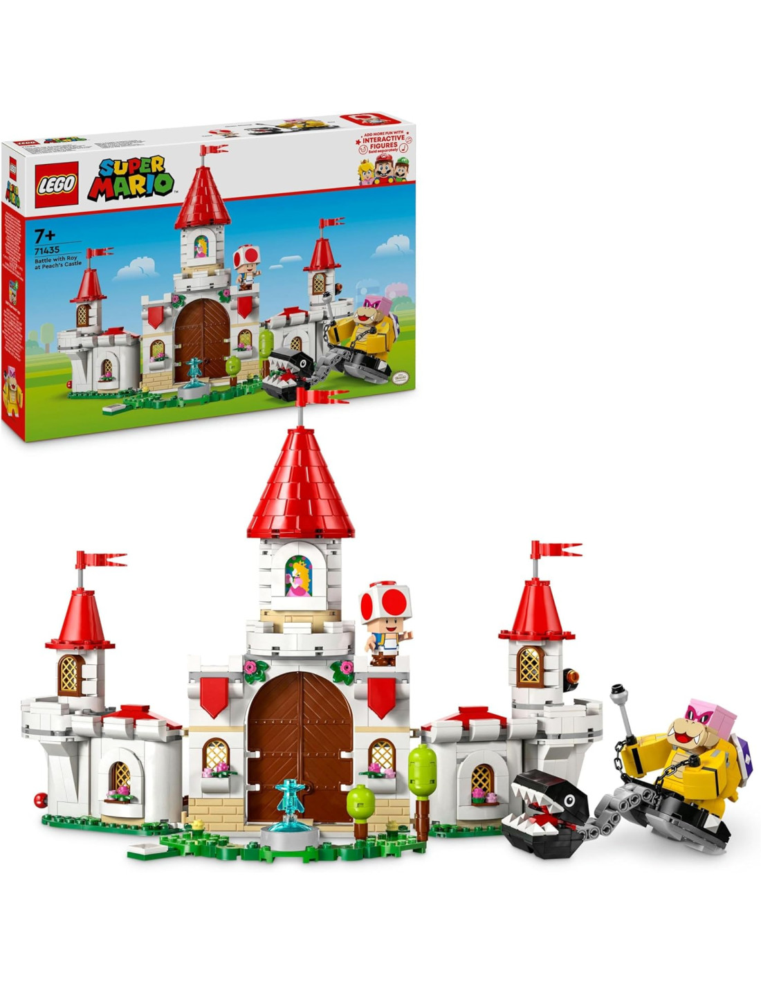 Il gioco d'avventura per bambini e bambine da 7 anni su, il set LEGO Super Mario la Battaglia con Roy al Castello di Peach (71435) giocattolo, permette ai piccoli di esplorare, combattere e giocare di ruolo in un'iconica ambientazione Super Mario. Questo set è un fantastico regalo di compleanno per i fan dei gadget e dei personaggi Nintedo, e contiene il modellino da costruire del castello della principessa Peach in mattoncini LEGO. Il modello è dotato di mura che crollano sotto assedio (facili da ricostruire), di una torre, di una catapulta giocattolo, di un trono girevole e di una fontana nel giardino. Sono inclusi 3 personaggi giocattolo LEGO Super Mario: Roy (per la prima volta in un set LEGO Super Mario), un Categnaccio e Toad. Basta aggiungere LEGO Mario, LEGO Luigi o LEGO Peach (non inclusi) per il gioco interattivo. I piccoli possono aiutare i loro eroi a sconfiggere Roy e a prendere il controllo del suo Categnaccio, trovando le Action Tag nascoste con cui sbloccare le reazioni digitali come la musica del pianoforte. Sono presenti le istruzioni per la costruzione nella confezione e nell'app LEGO Super Mario, che contiene anche idee creative su come costruire e giocare.