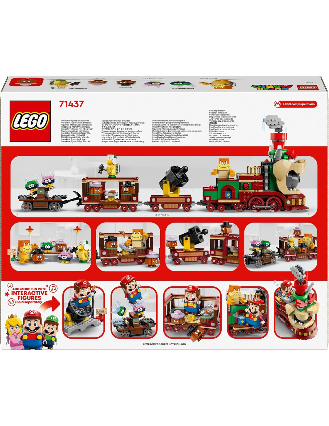Con il gioco d'avventura per bambini e bambine da 9 anni in su, il set LEGO Super Mario Bowser Express (71437), i piccoli fan gamer della Nintendo potranno salire a bordo di un divertente treno giocattolo da costruire. Questo divertente regalo di compleanno a tema Nintendo con i mattoncini LEGO, permette di realizzare un treno dotato di vagone con 2 stazioni giocattolo, oltre ad un blocco Super Stella, un Blocco ? e 6 personaggi LEGO Super Mario: un Martelkoopa giocattolo, un Boom Boom, 2 Goomba e 2 Coccinelli volanti. Per il gioco di ruolo interattivo, basta aggiungere uno dei personaggi tra LEGO Mario, LEGO Luigi o LEGO Peach (non inclusi). I giovani possono inseguire il treno giocattolo sul carrello a mano, azionare la piattaforma girevole della locomotiva e attiva lo shooter a molla del carro cannone. Una volta sconfitti tutti i nemici, possono attivare i suoni del clacson mentre guidano il treno espresso di Bowser giocattolo verso la stazione. Un simpatico regalo di compleanno per i fan dei giochi Nintendo e delle costruzioni LEGO Super Mario. Sono presenti le istruzioni per la costruzione nella confezione o nell'app LEGO Super Mario, con cui ottenere idee creative su come costruire e giocare con questo set da collezione Nintendo.