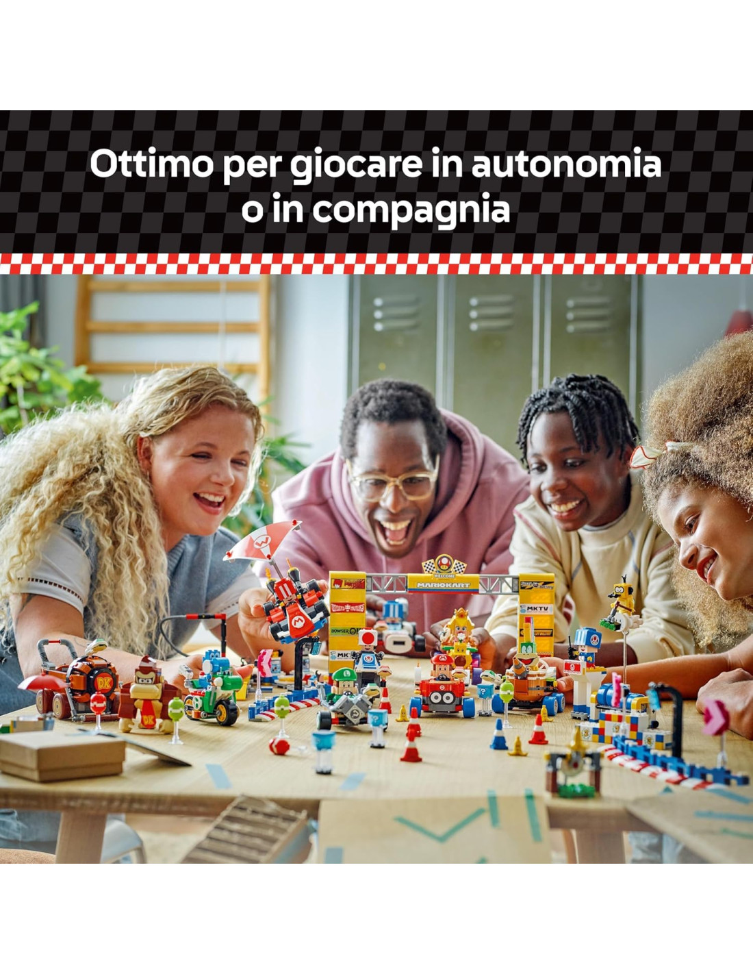 Set con macchina giocattolo Mario Kart da costruire: unisciti a Toad giocattolo (pit stop) per corse, derapate e planate con il modello in mattoncini del Mario Kart : Kart Standard LEGO Super Mario, oltre alla postazione da lavoro Personaggio Mario Kart di Toad giocattolo (pit stop): questo gioco d'avventura Mario Kart in mattoncini LEGO contiene un personaggio di Toad (pit stop) con la tuta rossa da meccanico, oltre ad un elemento banana con volto decorato Set Nintendo Mario Kart da collezione: il Kart standard è dotato di un Superplani staccabile, ruote da drifting e una funzione di lancio per sparare gusci contro il bersaglio nella postazione di lavoro Gioco Super Mario interattivo: posiziona LEGO Mario, LEGO Luigi o LEGO Peach (personaggi non inclusi) nel kart per effetti sonori/visivi e salta sul'Action Tag della postazione di lavoro per altre reazioni digitali Idea regalo di compleanno Nintendo LEGO Super Mario per bambini: questo set di giochi per bambini e bambine da 7 anni in su, è un ottimo regalo da gamer; per il gioco interattivo è necessario uno dei set 71439, 71440 o 71441 (disponibili a parte) Set da costruzione collezionabili Nintendo: esplora la gamma LEGO Mario Kart Super Mario e scopri altri veicoli (disponibili separatamente), su cui montare il Superplani e con cui gareggiare