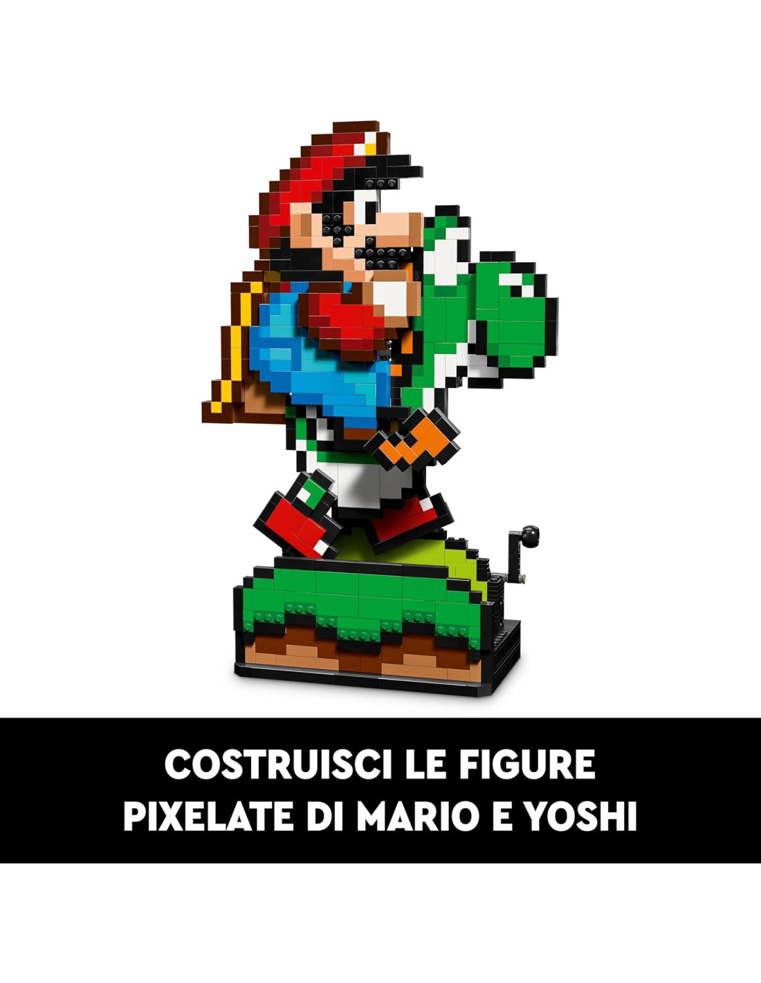 Una simpatica costruzione in mattoncini LEGO Super Mario per adulti, ottima come decorazione di casa di un appassionato di gadget Nintendo da collezione. Questo kit di modellismo per adulti presenta i personaggi di Mario e Yoshi in versione 'pixelata' da costruire, dotati di una funzione che gli consente di simulare i classici movimenti come nei videogiochi. Basta far girare una maniglia per far correre Yoshi con Mario LEGO posizionato sulla schiena, oltre a poter ruotare una manopola per azionare la lingua di Yoshi. Il modello include un'Action Tag, che consente di aggiungere un personaggio LEGO Mario, LEGO Luigi o LEGO Peach (dai set 71439, 71440 o 71441 – disponibili separatamente) per un'esperienza interattiva. Questo set LEGO per adulti è un'ottima idea regalo per un uomo o una donna, e per tutti gli appassionati di modelli Super Mario da collezione. Il set comprende le istruzioni per la costruzione nell'app LEGO Builder, una guida semplice da seguire per vivere ogni fase creativa della costruzione come un'esperienza coinvolgente.