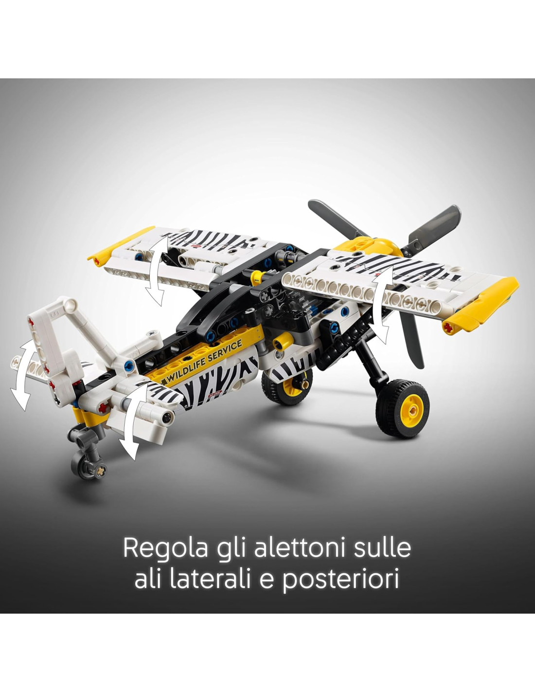 Modellino di aereo giocattolo da costruire: questo gioco con le costruzioni LEGO Technic per bambini e bambine da 8 anni in su, permette di realizzare un Aereo Bush con elica funzionante, alettoni regolabili e motore a 4 cilindri a pistoni Aeroplano giocattolo con funzionalità divertenti: i piccoli possono giocare in modo creativo mentre volano sul loro aereo LEGO, e immaginano infinite missioni di protezione della fauna con il loro aereo bush Design con stampa zebrata: questo aereo giocattolo con le costruzioni LEGO, è dotato di un design con stampa zebrata per riflettere il ruolo che questi velivoli svolgono nella protezione della fauna selvatica Un ottimo regalo di compleanno per bambini e bambine da 8 anni: fai decollare l'immaginazione dei piccoli con questo piccolo regalo, un set che farà felici i fan dei veicoli LEGO da costruire e gli appassionati di aerei giocattolo Giocattoli che introduco i piccoli all'ingegneria: i set con veicoli costruibili LEGO Technic presentano movimenti e meccanismi realistici che introducono i giovani costruttori LEGO, all'universo dell'ingegneria