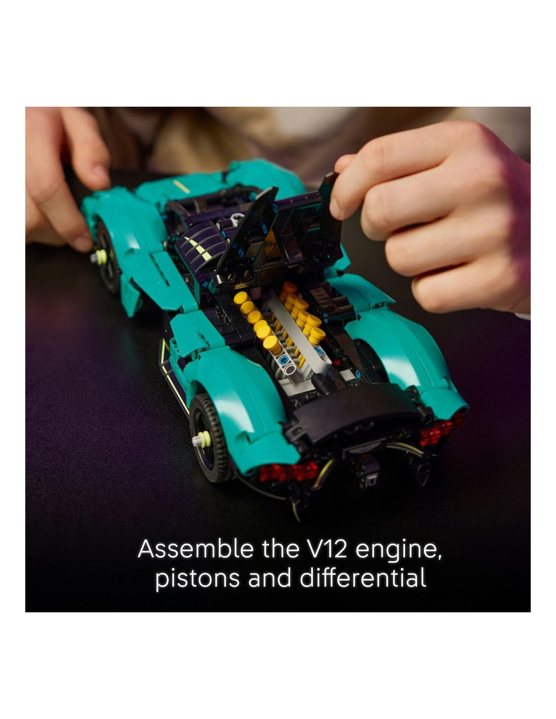 Un veicolo giocattolo con funzioni divertenti: scopri i tanti elementi mobili in questa auto LEGO in mattoncini, come il motore V12 con pistoni mobili, il differenziale e le porte ad ala di gabbiano apribili