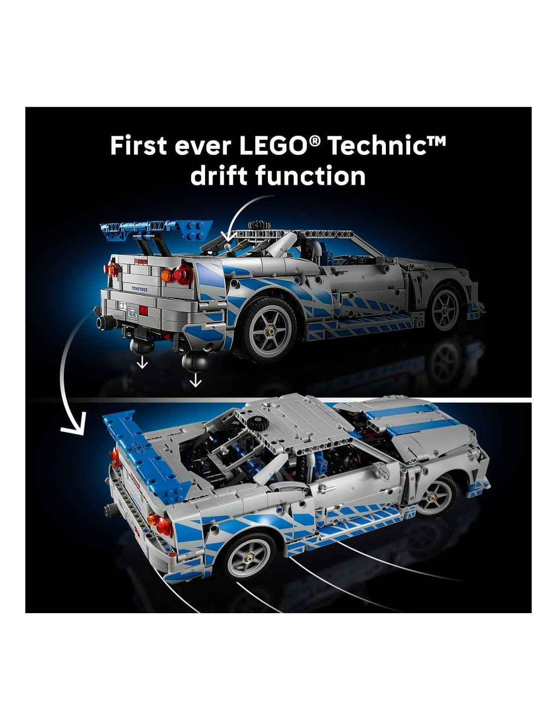 Preparati a sfide emozionanti: la funzione di derapata (la prima in assoluto per i set di veicoli LEGO) consente di sollevare l'auto per dar vita a manovre mozzafiato, ispirate alle corse presenti nel franchise cinematografico