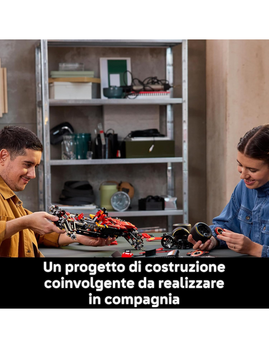 Questo set è una fantastica idea regalo per un uomo, per una donna, per gli amanti delle auto e per i fan degli sport motoristici, un progetto di costruzione coinvolgente che ti consente di assemblare una auto da F1 LEGO con funzioni realistiche, in scala 1:8. Sviluppa nuove competenze ingegneristiche costruendo tutti i particolari della Ferrari SF-24 LEGO Technic, come lo sterzo, il cambio a 2 velocità e gli pneumatici stampati. Entra nella zona DRS regolando l'ala su e giù, quindi rimuovi la cover del motore per esaminare il motore V6 con l'MGU-H che gira. Immagina l'emozione di un duello a colpi di acceleratore all'ultimo giro, prima di esporre questo modellino da costruire di auto da corsa come decorazione di casa o dell'ufficio, che omaggia la tua passione per la F1. Costruisci il garage dei tuoi sogni con i set LEGO Technic da collezione per adulti (ciascuno disponibile separatamente). Goditi un'esperienza di costruzione intuitiva con l'app LEGO Builder, dove puoi ingrandire e ruotare il tuo veicolo in 3D, monitorare i tuoi progressi e salvare tutti i tuoi set in un unico posto.