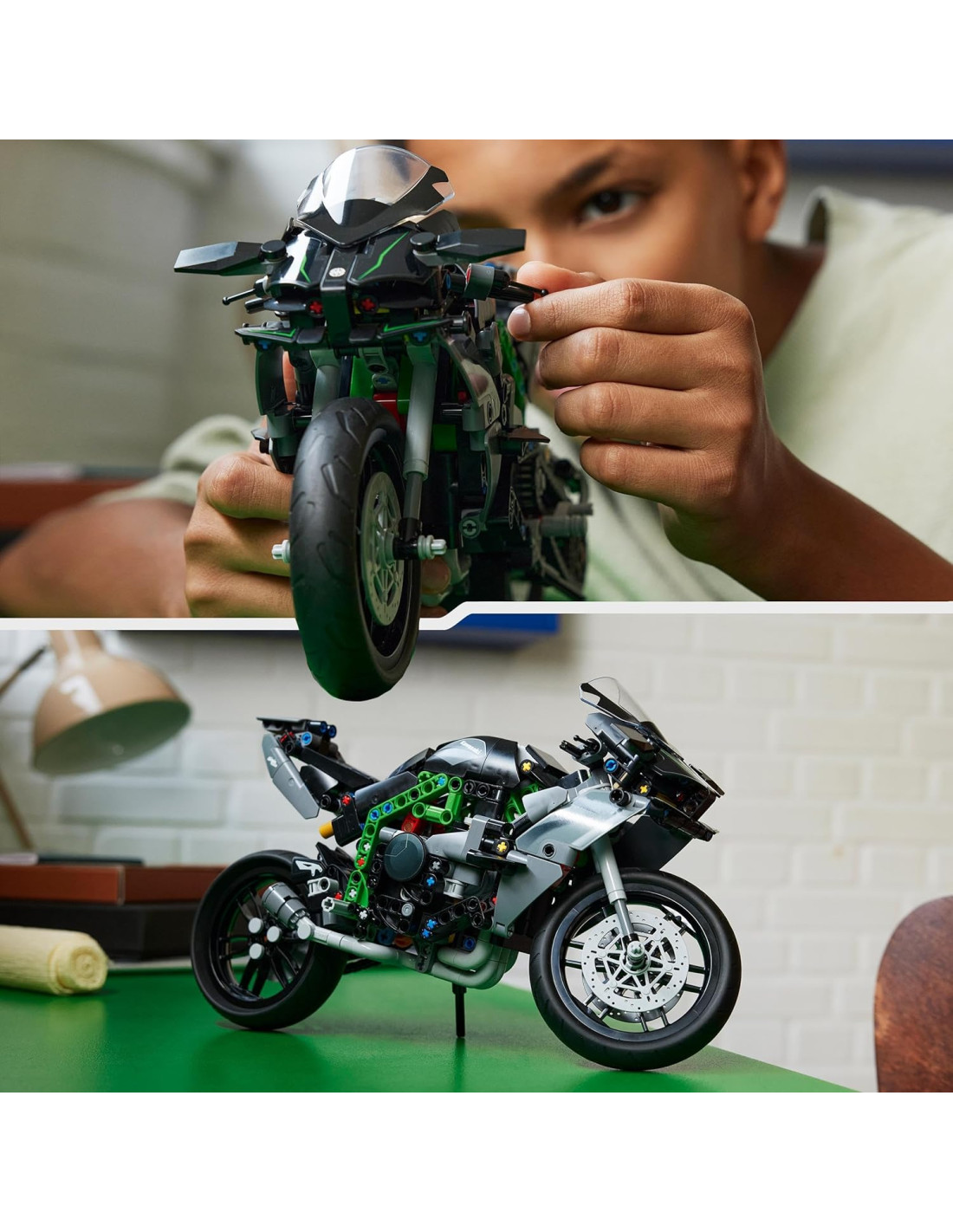 Ispira i bambini a esplorare l'ingegneria e la tecnologia con la Motocicletta Kawasaki Ninja H2R LEGO Technic (42170) giocattolo per bambini dai 10 anni in su. Questo set costruibile per i bambini e le bambine ricrea fedelmente i dettagli di una delle motociclette di serie più veloci al mondo: la Kawasaki Ninja H2R. Questo modellino di motocicletta in scala 1:8, fantastico regalo per bambini, è dotato di sterzo, sospensioni, cambio a 2 velocità, motore articolato a 4 pistoni e turbocompressore. Lo speciale elemento del parabrezza presenta decorazioni personalizzate e il logo Kawasaki è posizionato su entrambi i lati del serbatoio del carburante. I bambini possono divertirsi a ricreare le caratteristiche e giocare con le diverse funzioni prima di utilizzare il cavalletto per esporre con orgoglio il loro modello di veicolo giocattolo. I set di costruzione LEGO Technic per bambini presentano dettagli realistici che introducono i giovani costruttori LEGO all'ingegneria in modo accessibile. Regala al tuo bambino un'avventura di costruzione intuitiva con l'app LEGO Builder, dove potrà ingrandire e ruotare i modelli in 3D e monitorare i suoi progressi.