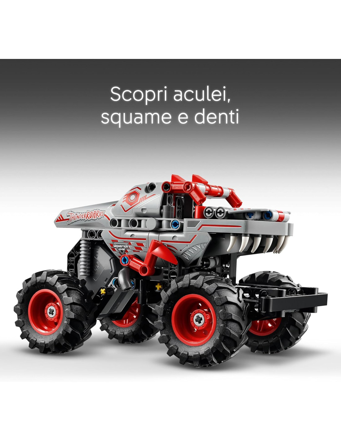 Monster truck LEGO Technic da costruire: il gioco per bambini e bambine da 7 anni in su, il Pull-Back Monster Jam ThunderROARus, offre ai giovani amanti dei monster truck un veicolo 'dinosauro' giocattolo per gare emozionanti Veicolo LEGO Technic con azione pull-back: tira indietro il truck e quindi rilascialo per ricreare le acrobatiche sfide e azioni di gara, dei mezzi nell'arena Monster Jam Caratteristiche ispirate ai dinosauri: il monster truck giocattolo presenta dettagli di design autentici, come squame, aculei, denti e pneumatici realistici ispirati al vero ThunderROARus Monster Jam Un regalo di compleanno per bambini e bambine da 7 anni in su: il set è una divertente idea regalo per i giovani fan delle costruzioni e dei veicoli LEGO, e offre tanto potenziale per sviluppare le loro capacità di costruzione Giochi LEGO Technic per scoprire l'ingegneria: i modellini dei giocattoli LEGO Technic, offrono movimenti e meccanismi realistici che introducono i giovani costruttori LEGO nell'universo dell'ingegneria