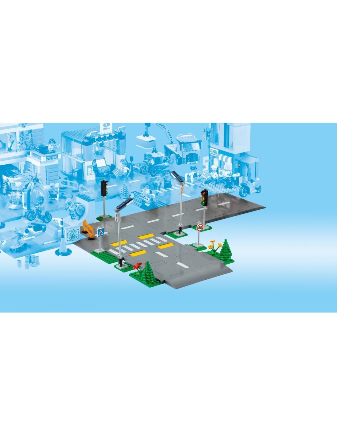 Cosa c'è nella scatola? I bambini troveranno 5 Piattaforme stradali LEGO con segnaletica orizzontale, dossi e strisce pedonali, oltre a lampioni che si illuminano al buio, semafori giocattolo, cartelli stradali, alberi e vegetazione.