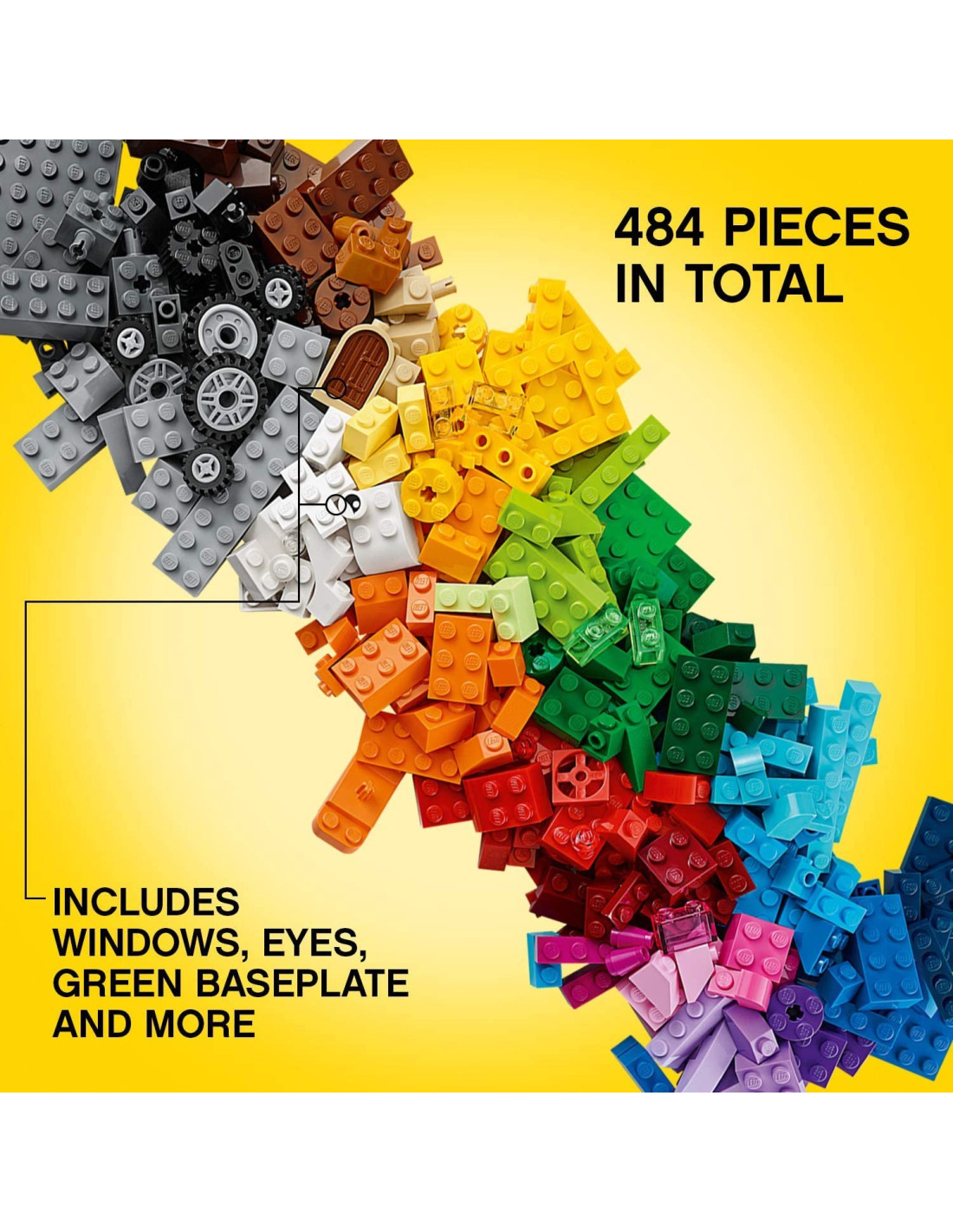 Include tanti mattoncini LEGO in 35 colori diversi; con 18 pneumatici e 18 cerchioni; molti elementi speciali tra cui una base 8 x 16 cm verde, una finestra con telaio e 3 set di occhi