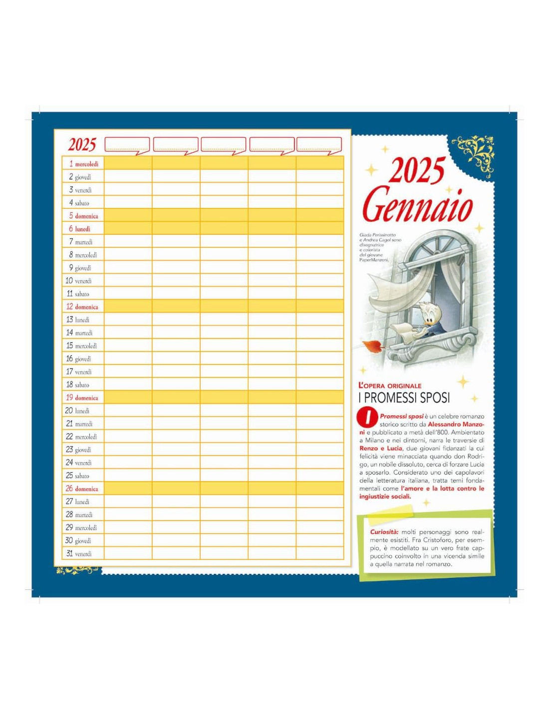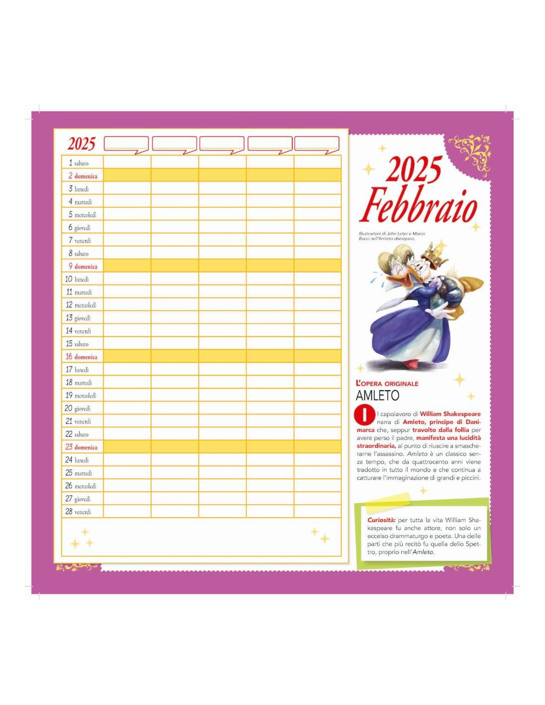 Il Calendario letterario per la famiglia Disney è molto più di uno strumento per segnare date: celebra i momenti condivisi ed è un invito a coltivare legami speciali; offre spazi dedicati per annotare eventi, compleanni, appuntamenti, anche utilizzando gli adesivi presenti su una pagina dedicata. Inoltre, il Calendario offre una panoramica sui classici della letteratura: ciascuna pagina dedicata al mese contiene quote ispirazionali e curiosità sull'opera, come I Promessi Sposi, La Divina Commedia, fino al Piccolo Principe, Orgoglio e Pregiudizio, Piccole Donne e Dracula. È uno strumento prezioso per condividere ricordi e per coltivare la connessione familiare attraverso spazi dedicati agli appuntamenti speciali.