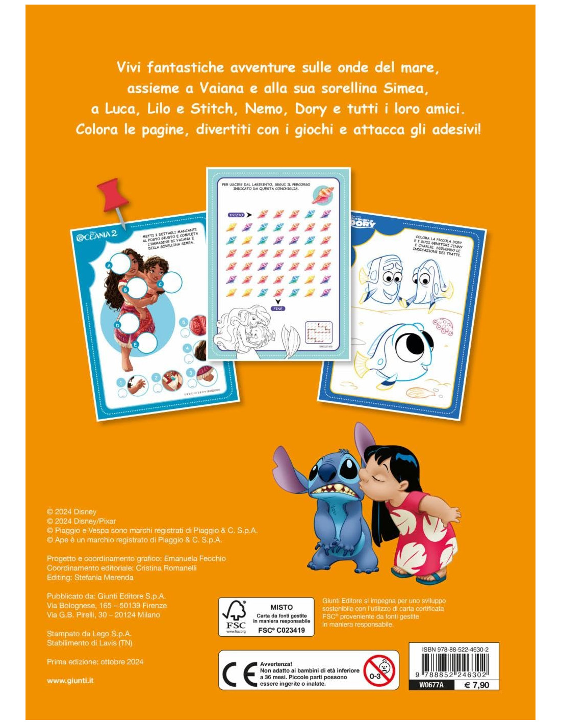 In questo volume con tante attività troviamo i personaggi Disney che più amano e rispettano il mare: Vaiana, Ariel. Lilo e Stitch, ma anche Nemo e i suoi amici pesci del grande oceano. 100 pagine ricche di bellissimi disegni da colorare, di giochi divertenti (semplici cruciverba, labirinti, differenze, sudoku ecc.). I testi sono semplici e scritti in stampatello maiuscolo così da agevolare anche una lettura autonoma. Le pagine sono coloratissime e con una grafica accattivante. A fine volume, anche due fogli di adesivi che il bambino può attaccare dove preferisce. Età di lettura: da 3 anni.