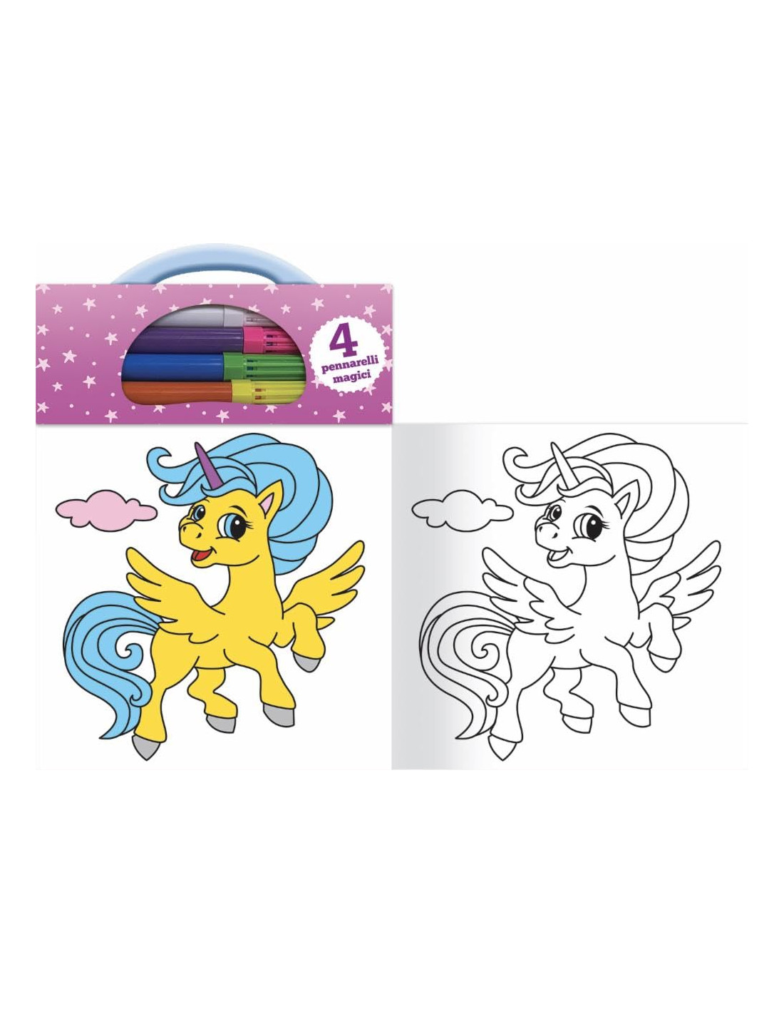 Un kit composto da quattro pennarelli magici e un albo con una pratica maniglia, con cui i bambini e le bambine potranno colorare gli unicorni seguendo il modello sulle pagine di sinistra. Il pennarello bianco, passato sul tratto di uno degli altri pennarelli, farà comparire un nuovo colore, quello indicato sul tappo, come per magia. Età di lettura: da 3 anni.