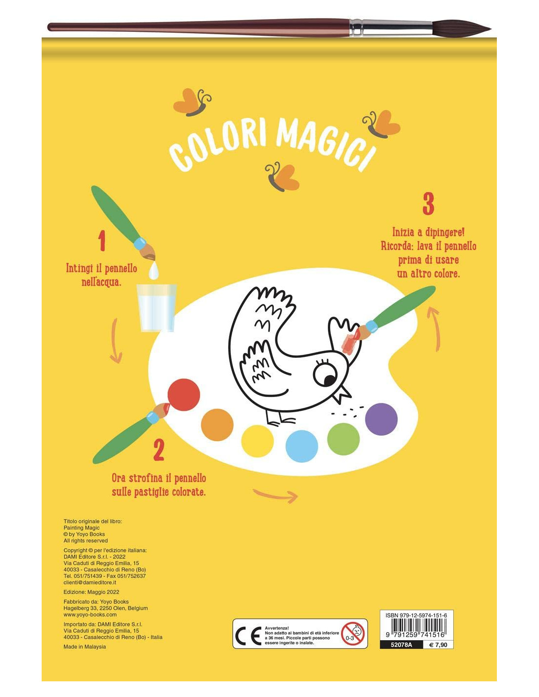 Libri pensati per far giocare insieme i piccoli artisti in poche, semplici mosse: per colorare ogni disegno dovranno solo bagnare con acqua il pennello in dotazione e passarlo sulle sei pastiglie di acquerelli presenti in ogni pagina. Le pagine staccabili diverranno quadretti da appendere. Età di lettura: da 3 anni.
