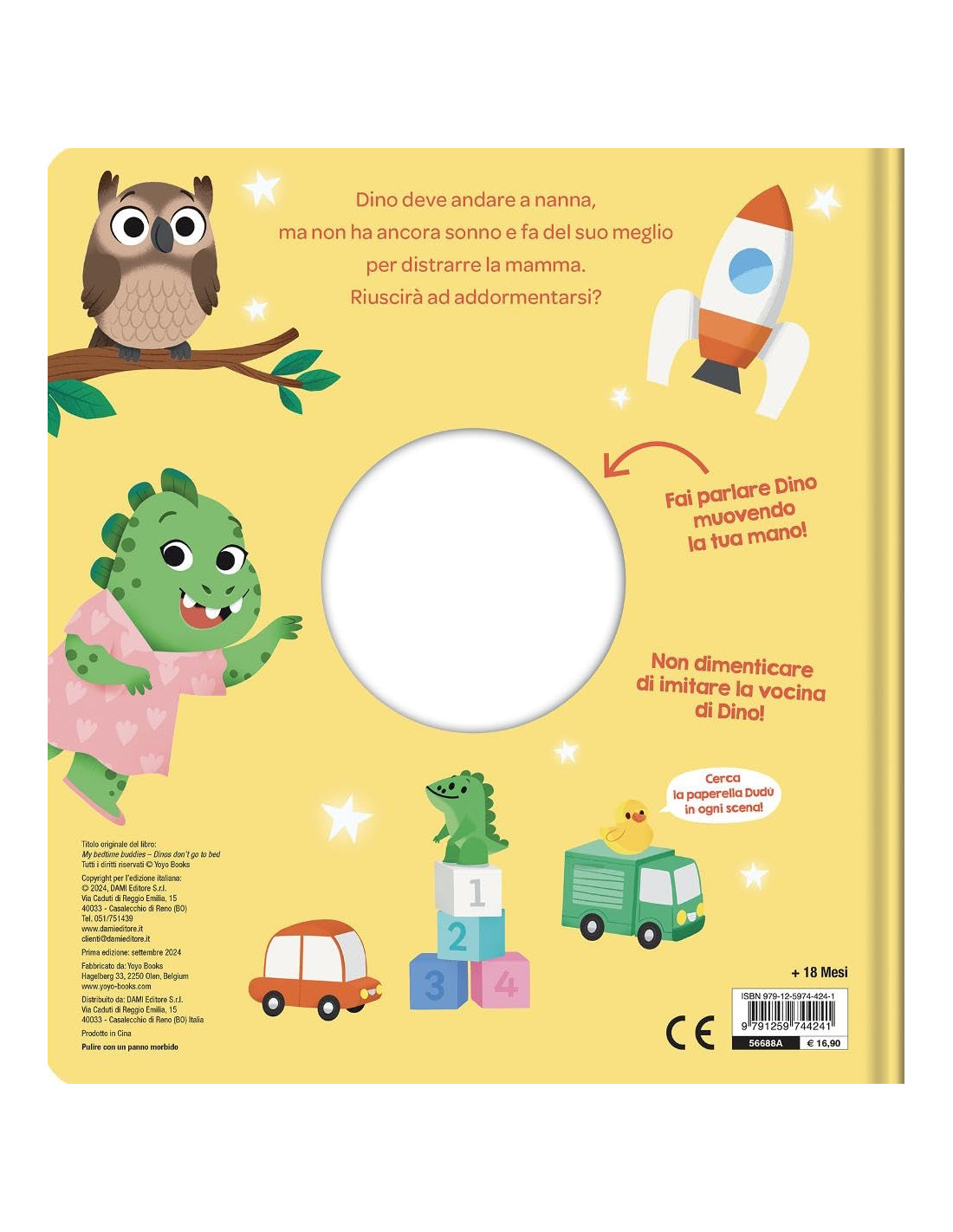 Un albo illustrato dotato di una morbida marionetta in peluches. Infilando la mano nella marionetta, che può ruotare fino a 360 gradi, grandi e piccoli possono fare muovere la bocca di Dino, il dinosauro protagonista della storia, e allo stesso tempo imitare la sua voce. Per un'esperienza di lettura interattiva e spassosa!