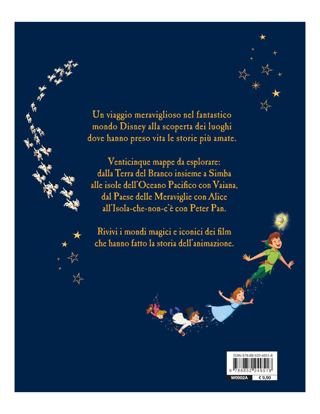 Il libro è un grande atlante per esplorare il mondo incantato della Disney attraverso 25 mappe che ci portano alla scoperta dei mondi magici e unici dei grandi classici dell'animazione Disney. Ogni mappa illustrata dà vita ai film che conosciamo e amiamo, fornendo anche informazioni dettagliate sui film stessi e sui loro affascinanti personaggi. Avventura senza precedenti mentre viaggiate nelle terre selvagge de Il Re Leone, esplorate le profondità marine con Ariel e affrontate le sfide senza tempo del Paese delle Meraviglie insieme ad Alice. Volate via verso l'Isola che Non C'è con il coraggioso Peter Pan e lasciatevi trasportare dalla Corrente Australiana Orientale insieme a Marlin e Dory. Il volume include le mappe di ben 25 film: Peter Pan, Dumbo, Pinocchio, Alice nel Paese delle Meraviglie, Il Libro della Giungla, La Bella e la Bestia, Alla ricerca di Nemo, Monsters&CO, Coco, Inside Out, Cars, Up, La Sirenetta, Aladdin, Frozen, Biancaneve e i Sette Nani, Il Re Leone, Ratatouille, Gli Incredibili, La Carica dei 101, Moana, Ribelle - The Brave, Toy Story, Alla ricerca di Dory e A Bug's Life. Età di lettura: da 6 anni.
