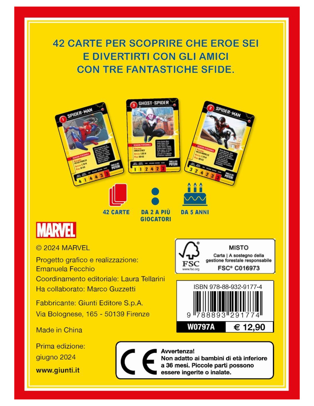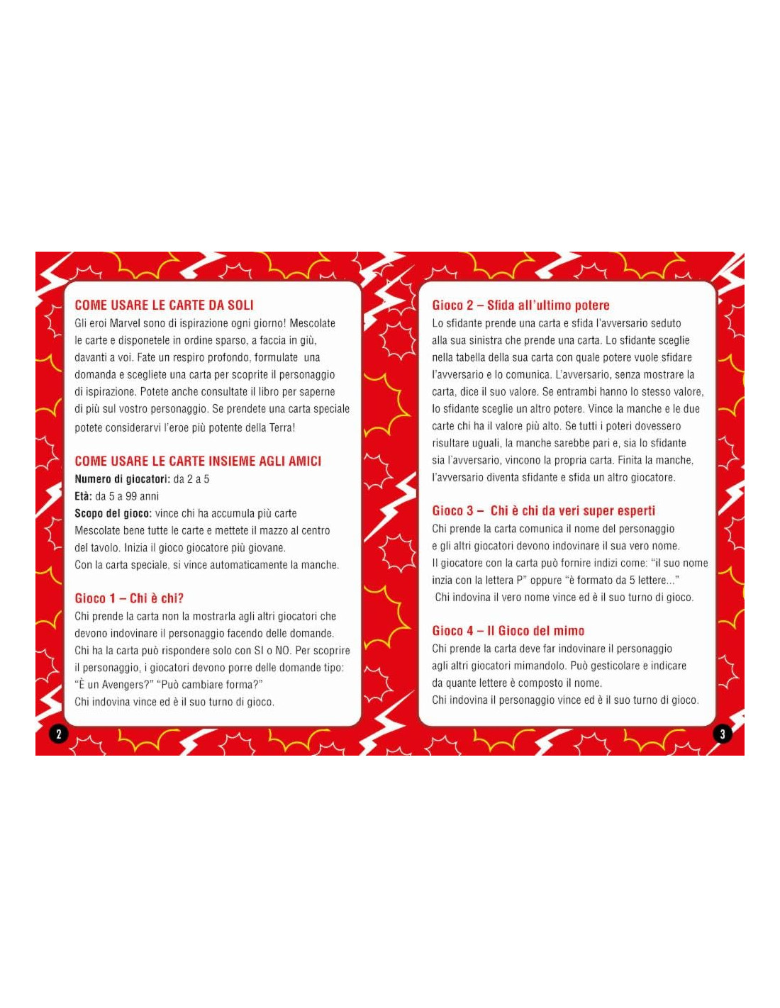 Un cofanetto che contiene 40 carte con i personaggi Marvel e 2 carte jolly speciali, più un libretto di 24 pagine con le istruzioni di gioco e le schede dei personaggi. Un volume dedicato al mondo Marvel, pensato per il divertimento di tutta la famiglia, oppure da soli o con un amico, per mettere alla prova le conoscenze su Spider-Man, sugli Avengers e sui Guardiani della Galassia. Giocare è un modo bellissimo per stare insieme, a tutte le età. Età di lettura: da 6 anni.