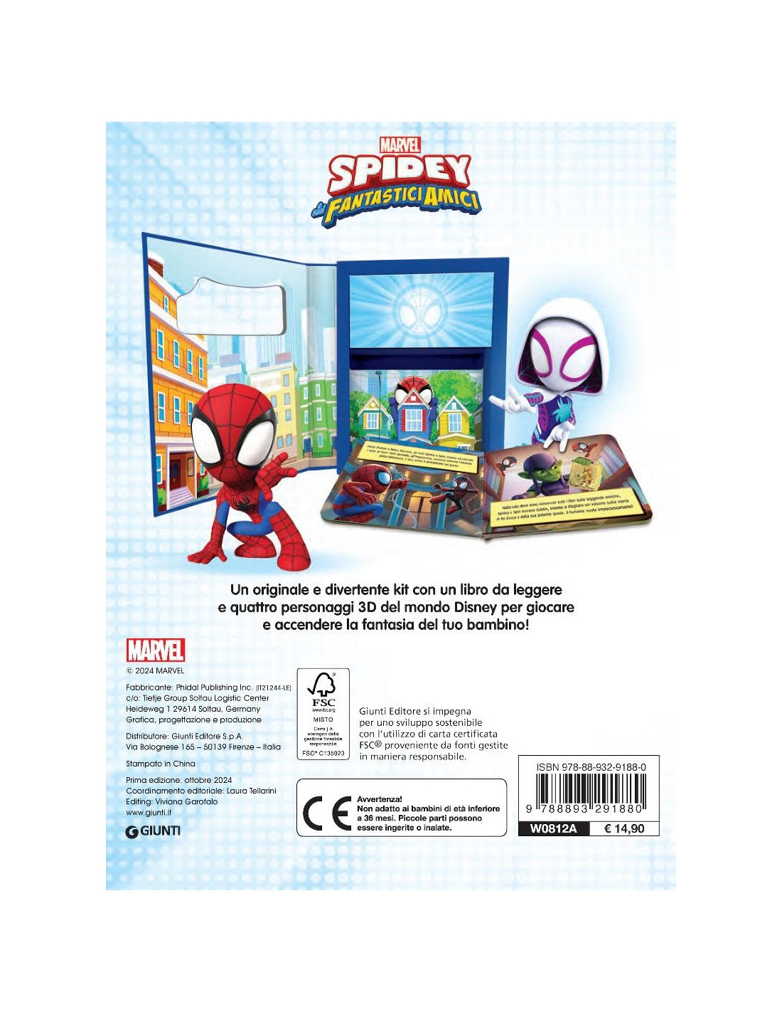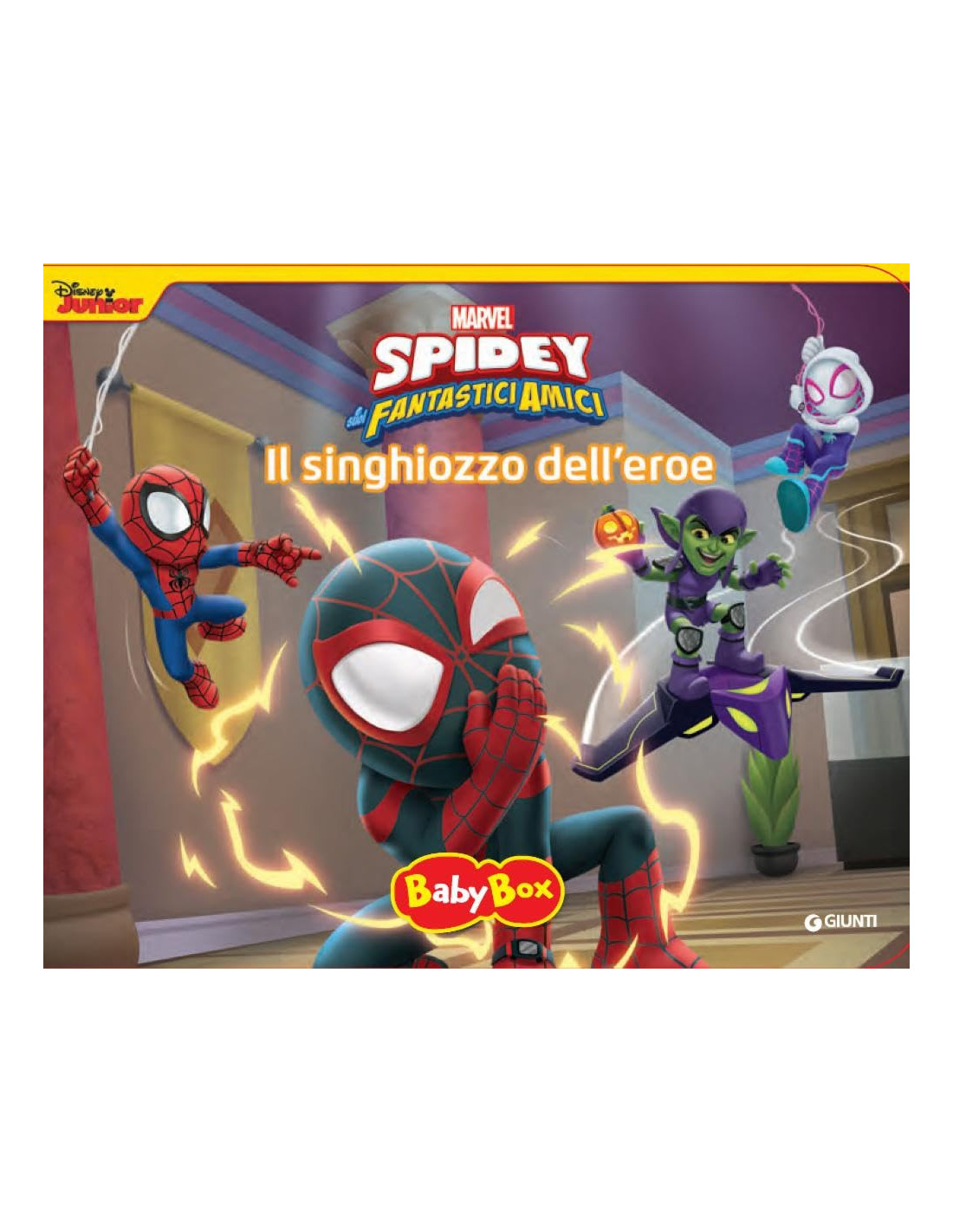 Il Baby Box è un libro stimolante che accompagna i lettori più piccoli alla scoperta del mondo di Spidey e dei suoi fantastici amici. La pratica scatola a forma di libro contiene un libro cartonato e 4 figurine 3d di plastica. Molto pratica, consente al bambino di riporre in ordine il libro e le figurine dopo l'uso. Il doppio utilizzo (lettura/gioco) favorisce il processo di identificazione e lo sviluppo delle attività manuali. Età di lettura: da 3 anni.