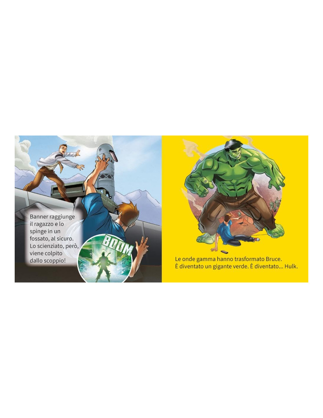 Un titolo novità dedicato ai personaggi Marvel. Bruce Banner è uno scienziato che, esposto a radiazioni gamma, si trasforma in Hulk ogni volta che perde il controllo della rabbia. Diviso tra la sua natura umana e mostruosa, diventa un eroe che, con la sua forza distruttiva, difende il mondo da minacce estremamente pericolose. Una nuova avventura per la storica collana di libri quadrati, perfetti per la prima biblioteca dei bambini. Età di lettura: da 2 anni.