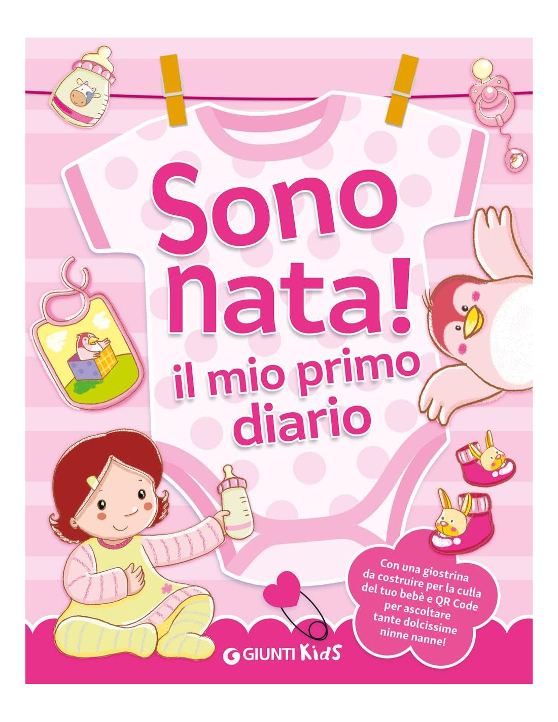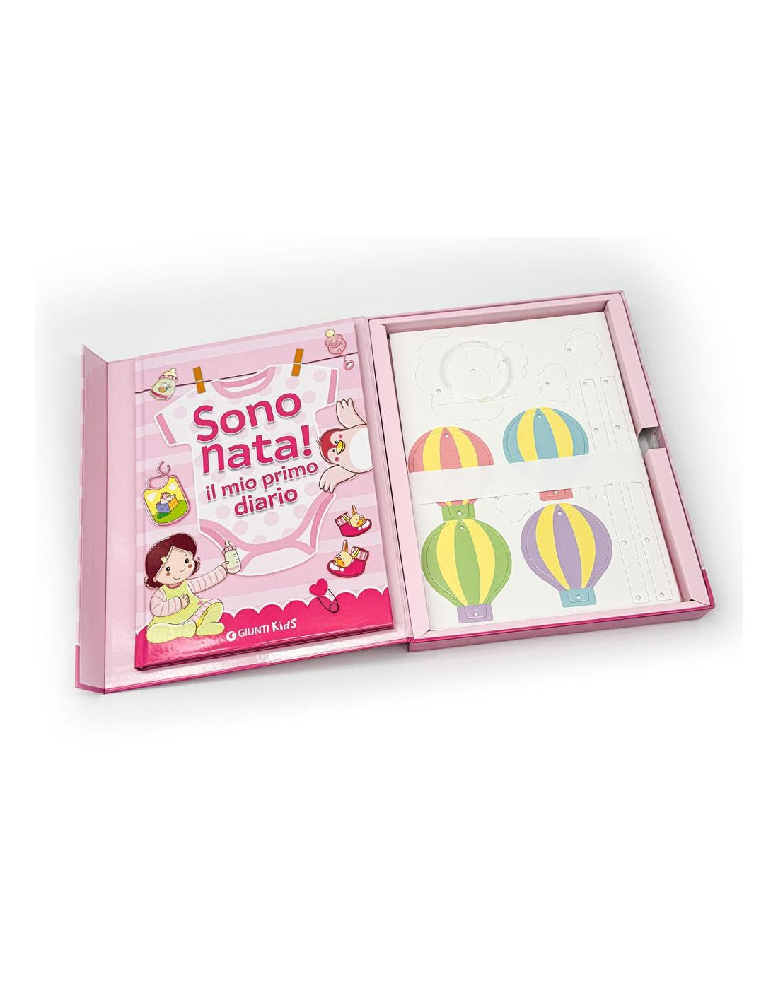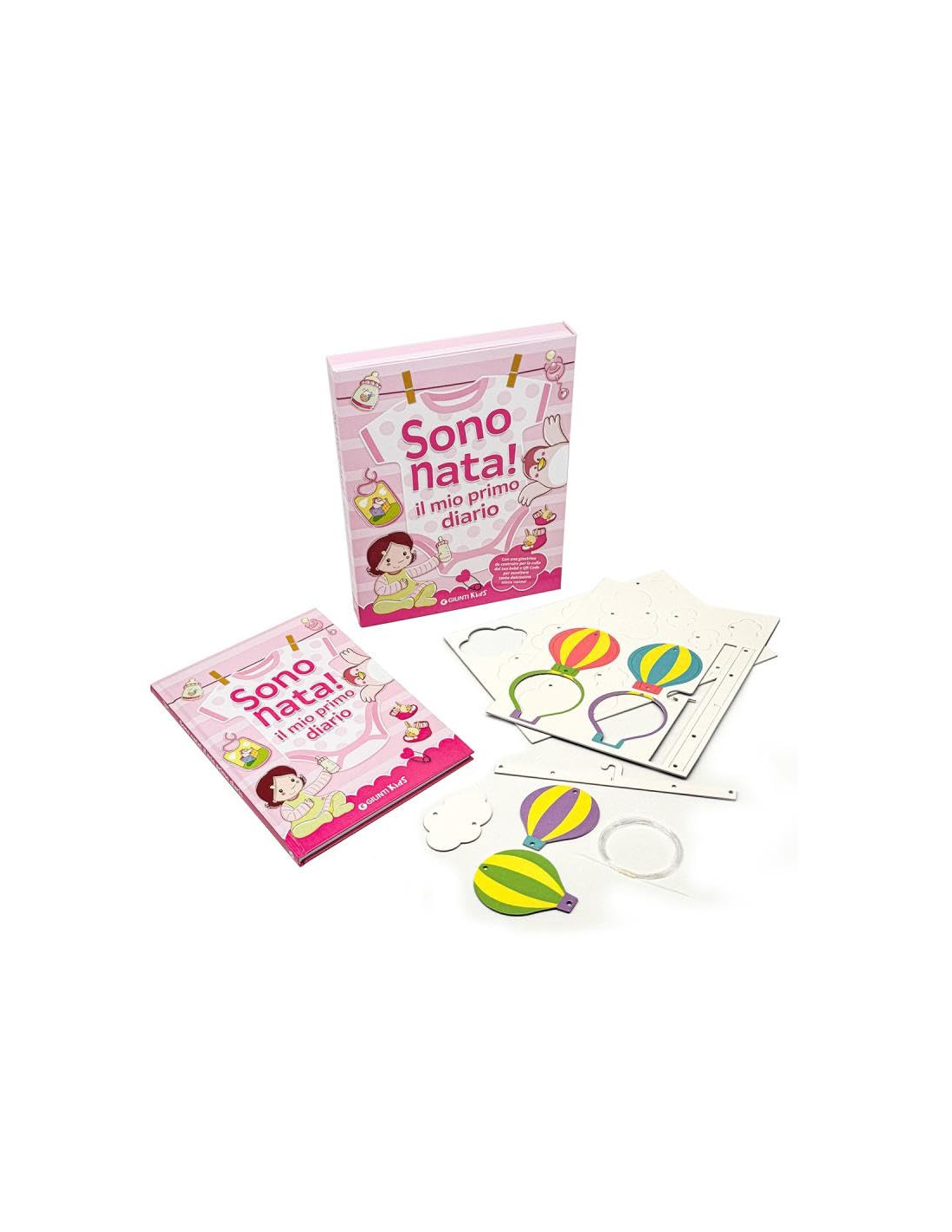 Un cofanetto regalo per celebrare la nuova nata. Al suo interno un diario da compilare e personalizzare con dolci pensieri e con tutte le informazione sulla piccola, tenere ninna nanne da ascoltare tramite QR Code e una giostrina da montare e da appendere in cameretta.