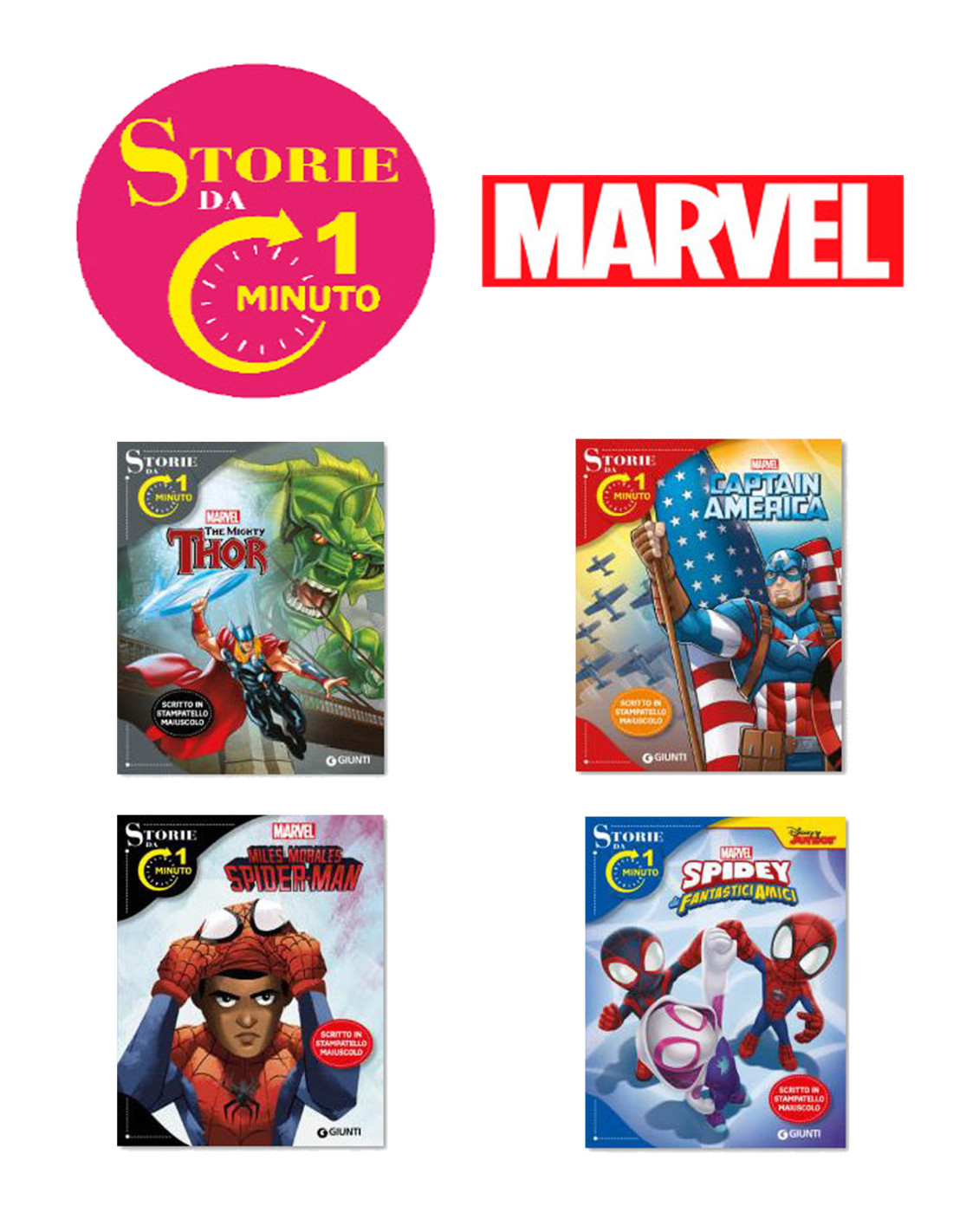 Volumi di 32 pagine monotematici, spillati, in stampatello maiuscolo, ad un prezzo altamente competitivo. Storie per sviluppare pian piano l'abitudine di dedicare tempo alla lettura e per imparare a leggere autonomamente. Nella collana Storie da 1 minuto si aggiungono (ai 5 già usciti) 4 nuovi volumi: tre dedicati alle origini degli eroi Marvel + 1 volume di Spidey (primo titolo della serie in collana). I libri disponibili sono The Mighty Thor – Il drago di giada, Spidey e i suoi fantastici amici – La forza del trio, Miles Morales Spider-man – Un nuovo eroe, Captain America – L'attacco dei cyborg.