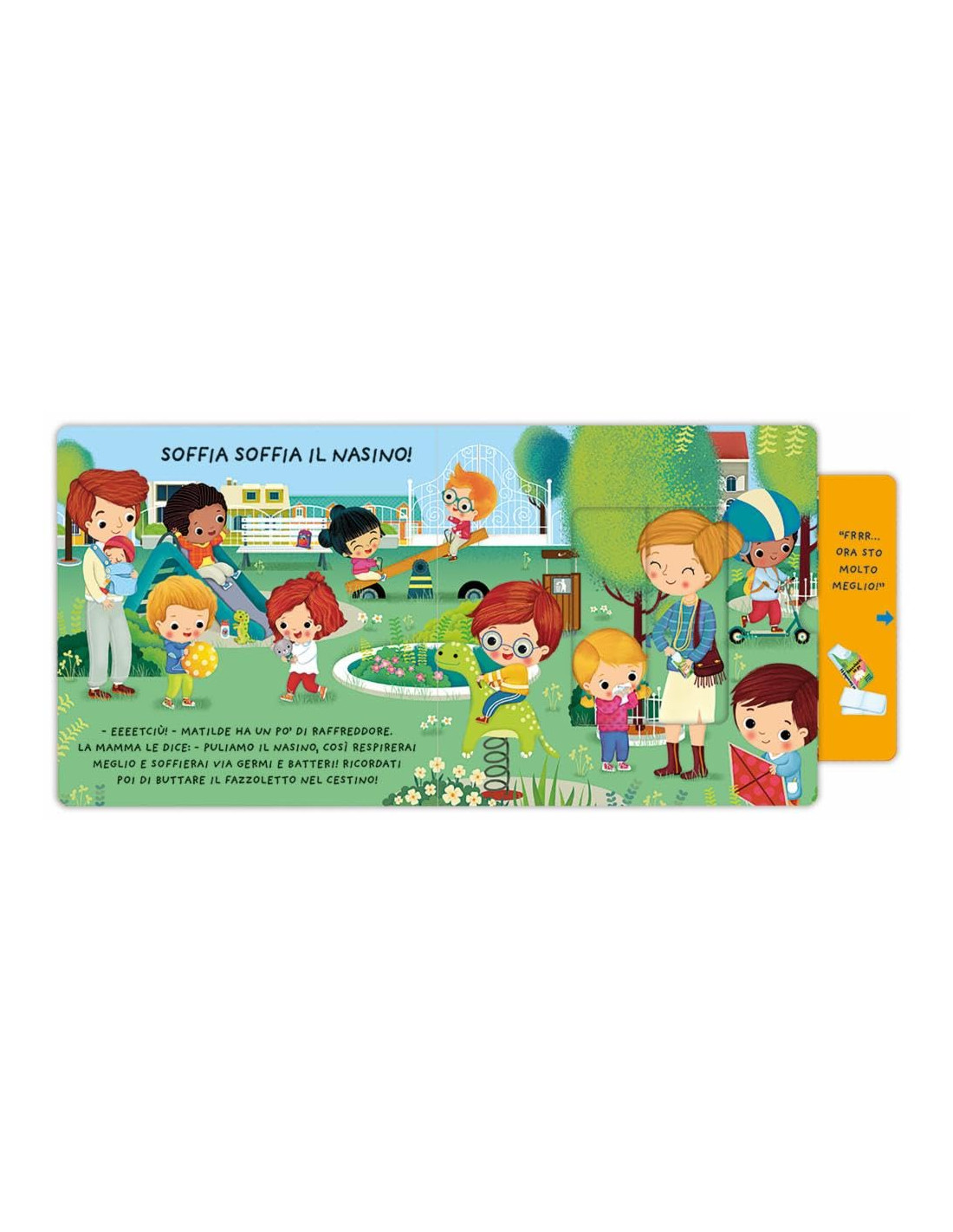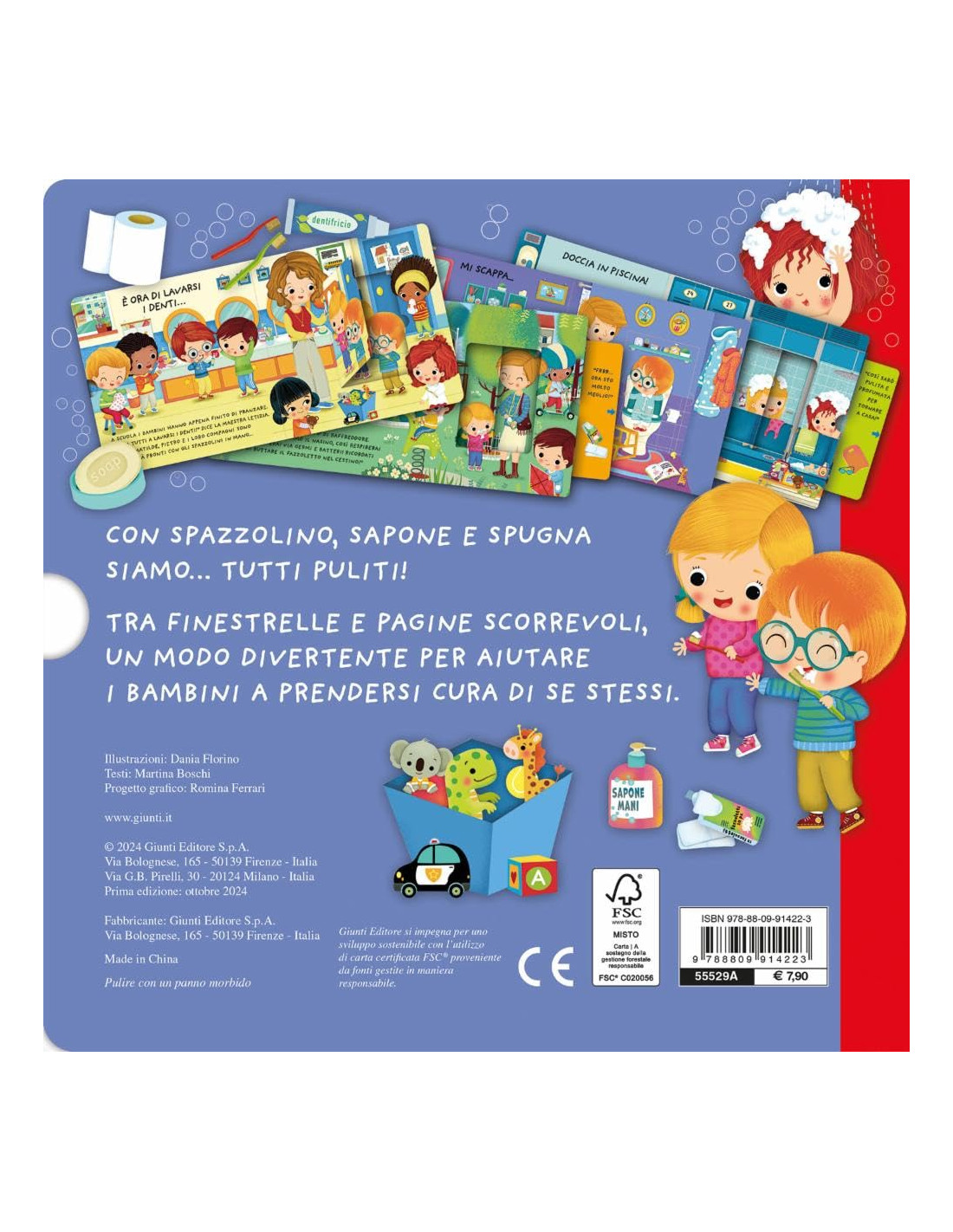 Lavarsi le mani, i denti, soffiarsi il nasino e farsi la doccia possono sembrare attività davvero noiose e faticose! Ma essere puliti è importante per la nostra salute e grazie a questo simpatico libro con grandi finestrelle e divertenti pagine scorrevoli, i più piccoli impareranno ad amare momenti della giornata che in genere sono poco apprezzati. Ogni pagina si concentra su un'azione da svolgere in contesti diversi e, con il meccanismo del prima-e-dopo, tutti i bambini impareranno semplici regole di igiene personale divertendosi. Età di lettura: da 3 anni.
