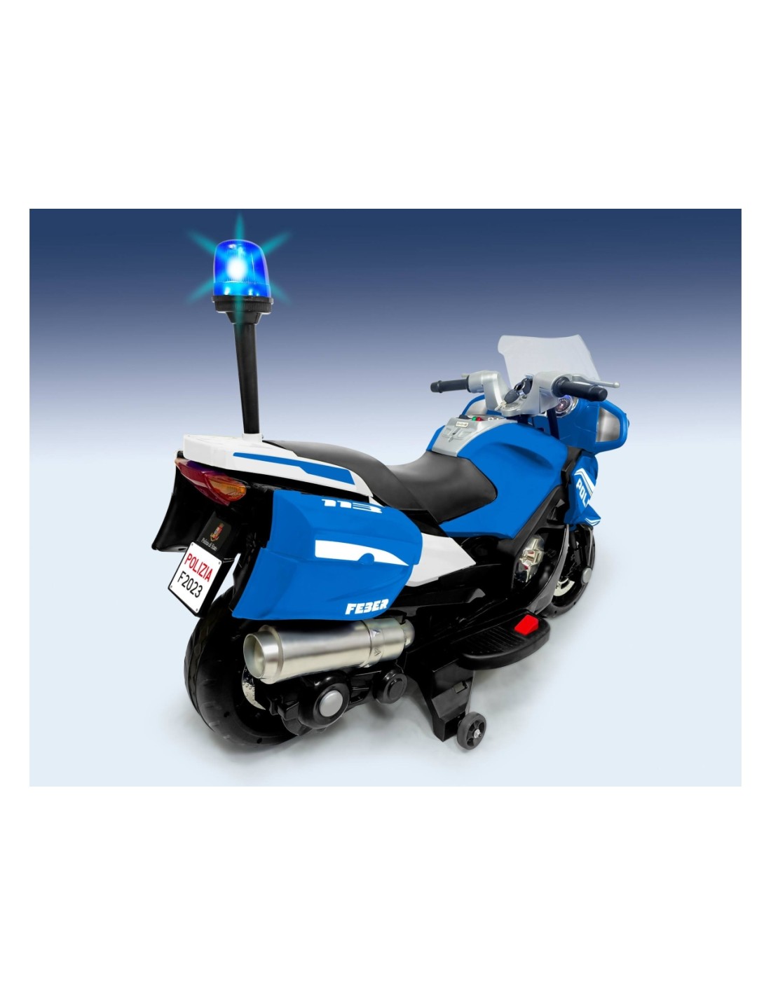 Moto Polizia di Stato 12V, è una motocicletta elettrica con marcia avanti e indietro, due velocità (3-7 km/h), luci a LED, suoni realistici di avviamento del motore, divertente adesivo della polizia e due ruote robuste per una maggiore stabilità. Include batteria e caricabatterie.