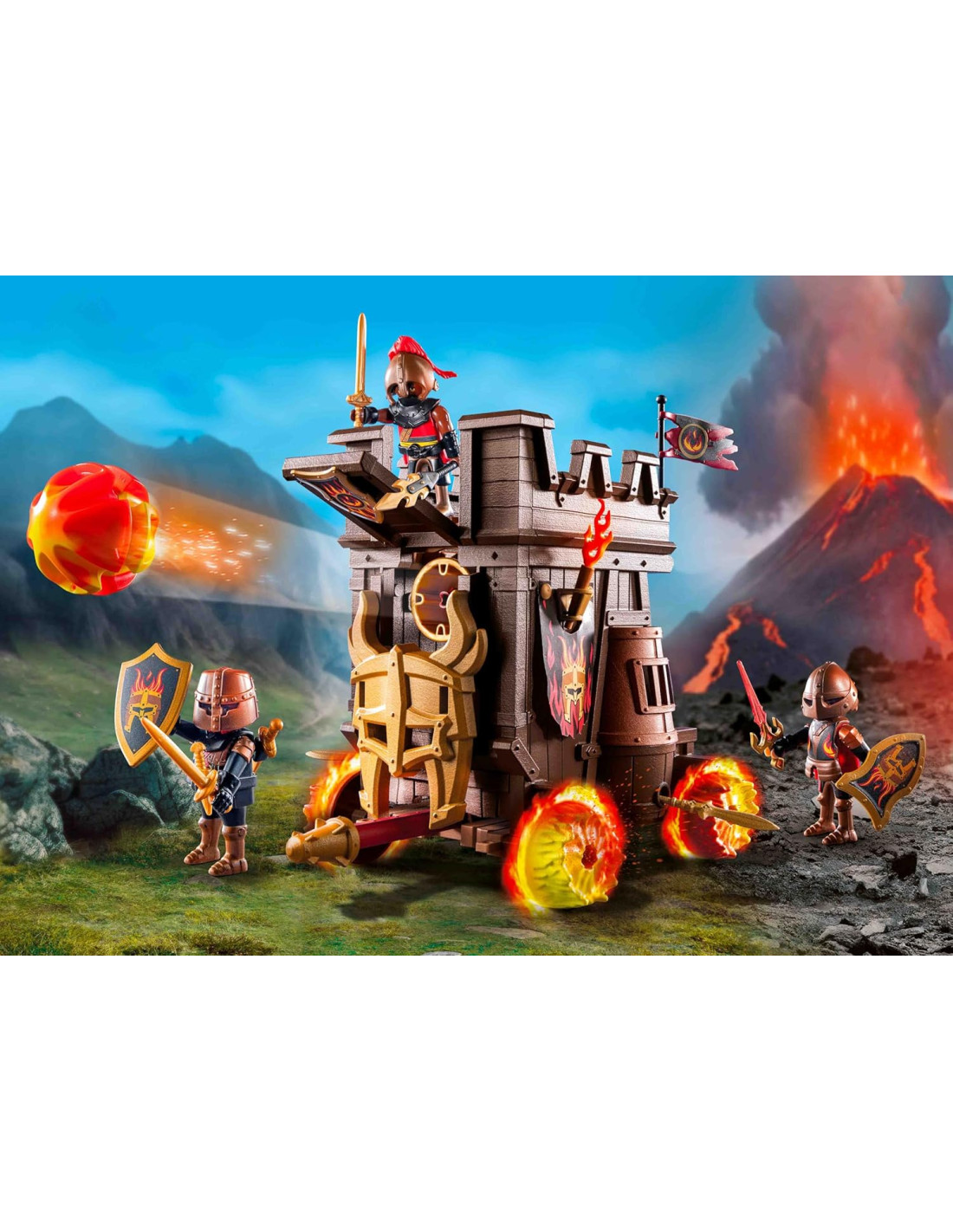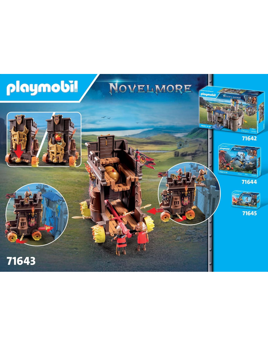 Assalto al Castello: Vivi battaglie ricche di azione con il carro d'assalto, equipaggiato con un potente ariete, un'enorme connane di fuoco e una spada montata lateralmente. Il carro è pronto per assaltare il castello Difesa Tattica: Lo scudo del carro può essere abbassato per rivelare il cannone di fuoco. Lancia il tuo attacco al castello con armi ingegnose e sistemi di difesa astuti. Perfetto per avventure emozionanti con i cavalieri! Il playset è adatto ai bambini dai 4 anni in su: le dimensioni dei personaggi sono adeguate alle mani dei più piccoli e danno una piacevole sensazione al tatto grazie ai bordi arrotondati Prodotto di alta qualità. Pulizia dei pezzi solo con acqua e senza l'uso di prodotti chimici Set di gioco con 68 pezzi: 3 personaggi PLAYMOBIL, e molti accessori, Materiale in plastica, LxLxH: 38,5 x 28,4 x 9,4 cm, peso: 842 g, Codice articolo 71643