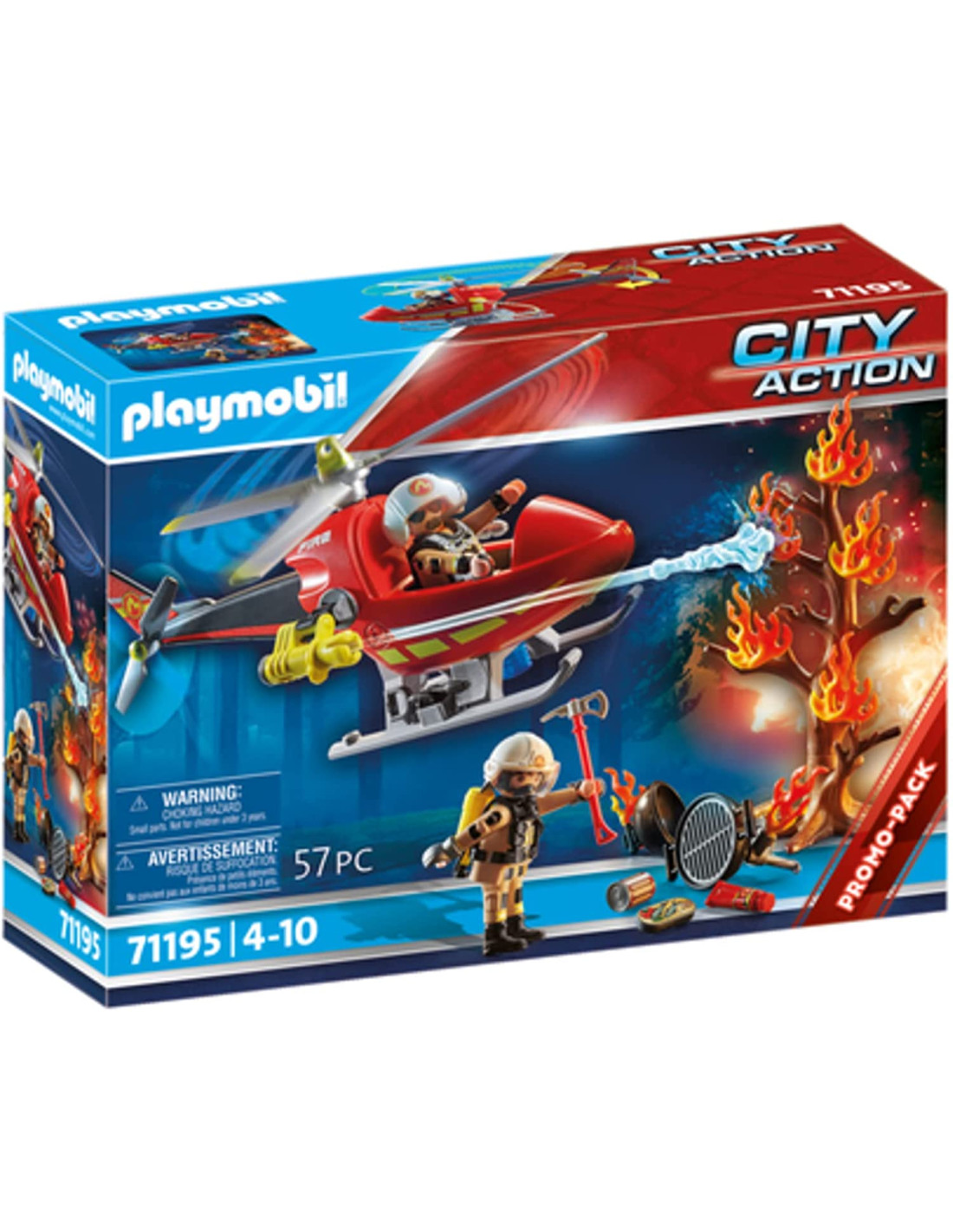 Contenuto, 1x playmobil city action elicottero dei vigili del fuoco, set di gioco con 57 pezzi e istruzioni, 1 elicottero playmobil, 1 albero, 2 pompieri playmobil, 53 accessori, materiale, plastica, lxlxa elicottero, 22,5-23,5 x 15,5-17 x 11 cm, peso, 153 g, 71195