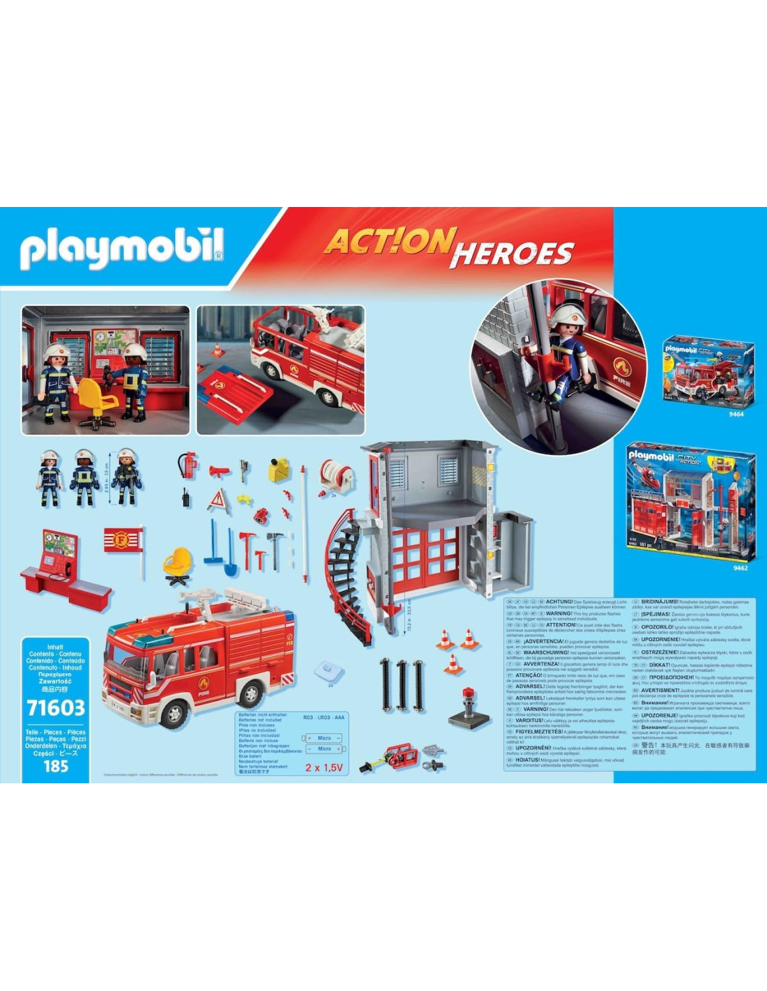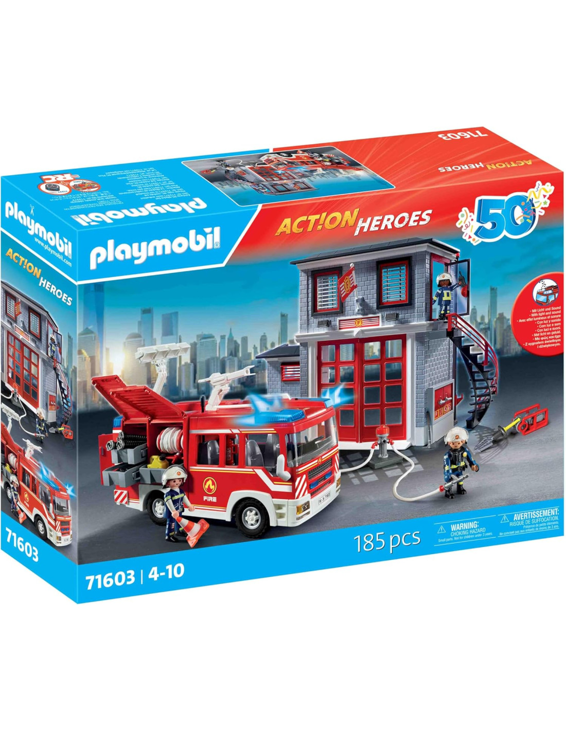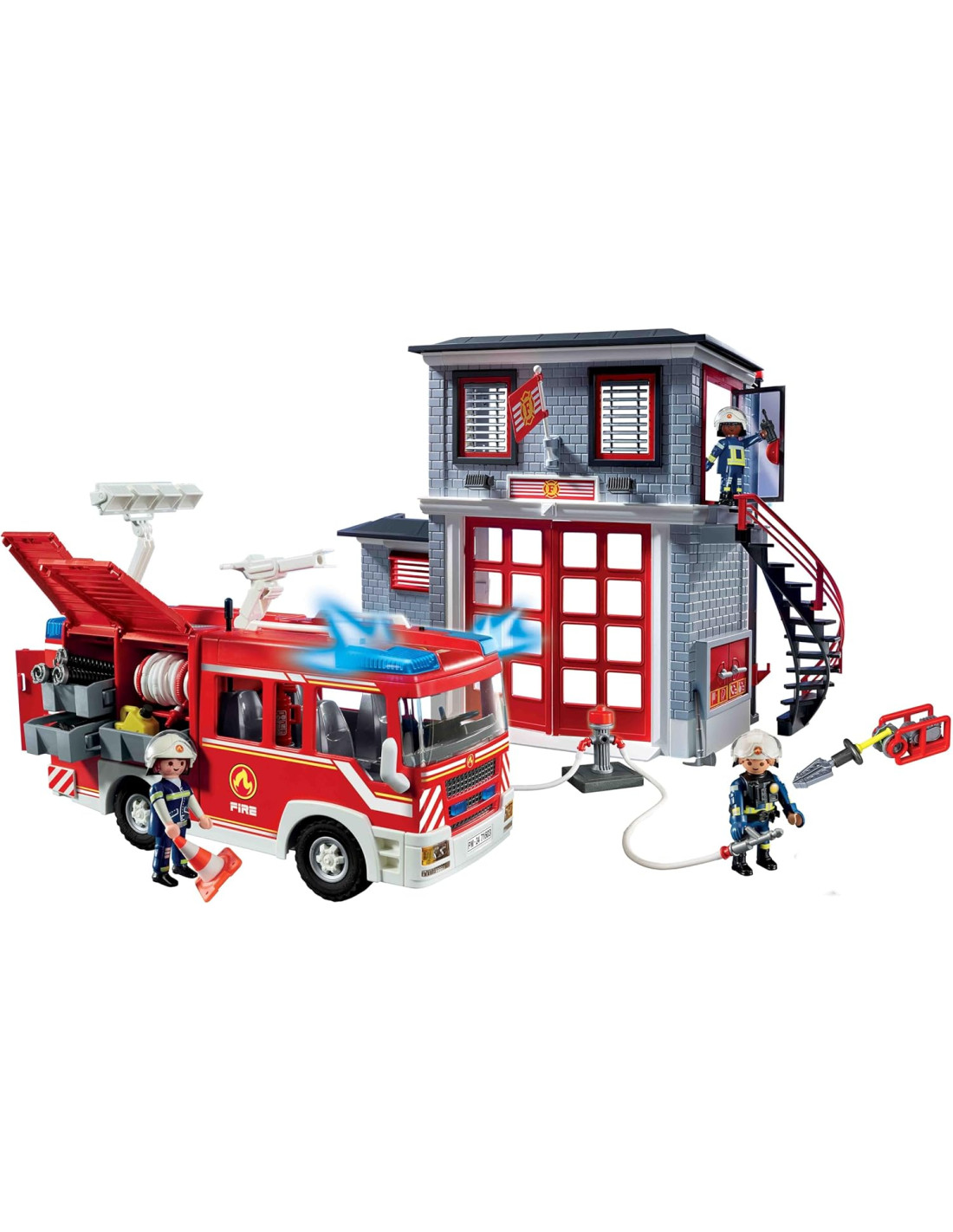 Grande Azione Antincendio: Un incendio nel centro città richiede un intervento rapido! Il Mega Set dei Vigili del Fuoco include tutto necessario. Con sirene, estintori e uno strumento di soccorso, la squadra dei vigili del fuoco è equipaggiata Attrezzatura Versatile: Il set comprende una caserma dei vigili del fuoco con scivolo, un centro operativo con scrivania, elementi per tubi e un verricello con uno strumento di soccorso. Ora riproposto in occasione del 50° anniversario di PLAYMOBIL! Il playset è adatto ai bambini dai 4 anni in su: le dimensioni dei personaggi sono adeguate alle mani dei più piccoli e danno una piacevole sensazione al tatto grazie ai bordi arrotondati Prodotto di alta qualità. Pulizia dei pezzi solo con acqua e senza l'uso di prodotti chimici Set di gioco con 185 pezzi: 3 personaggi PLAYMOBIL, e molti accessori, Materiale in plastica, LxLxH: 51,5 x 38,5 x 12,5 cm, peso: 2213 g, Codice articolo 71603