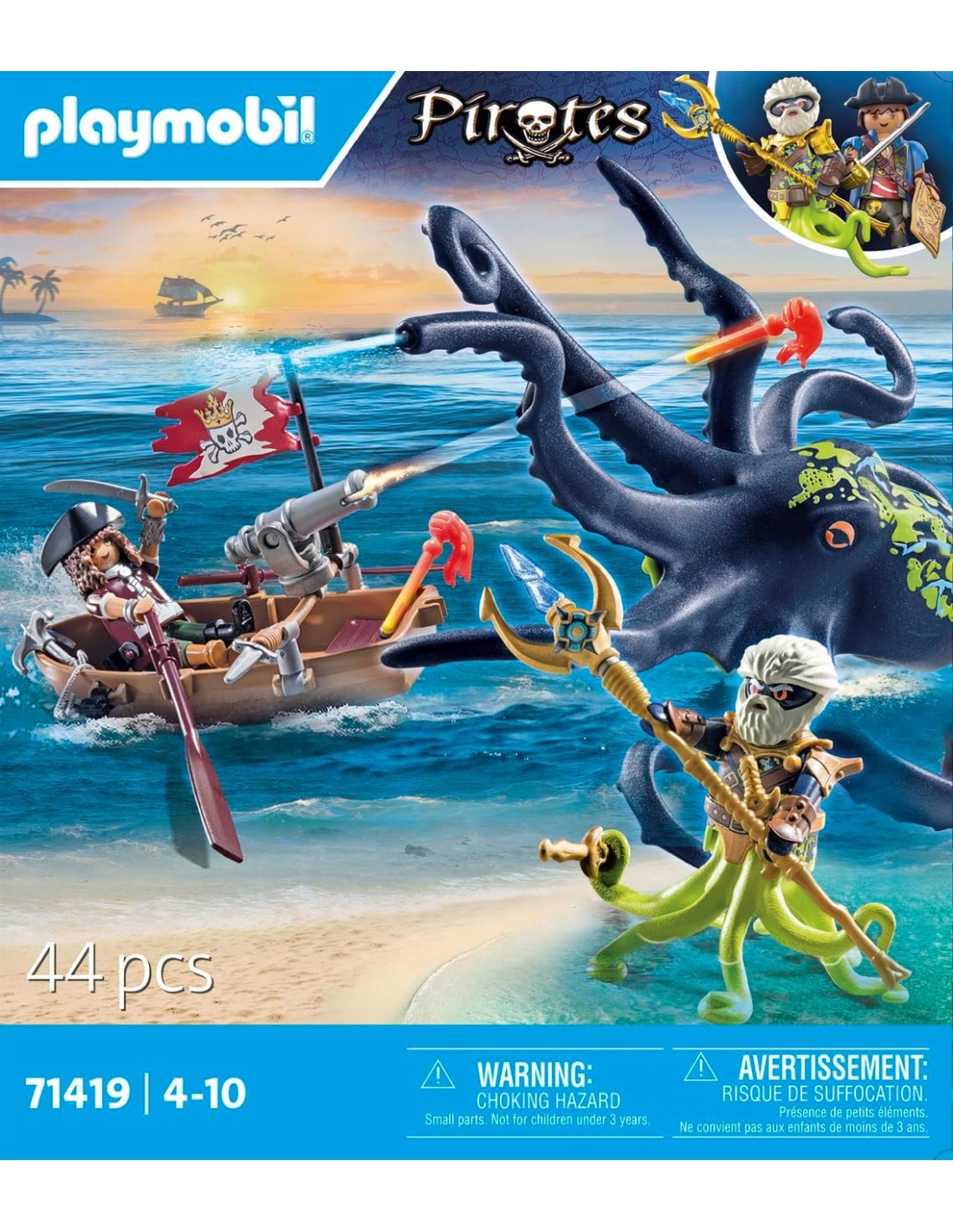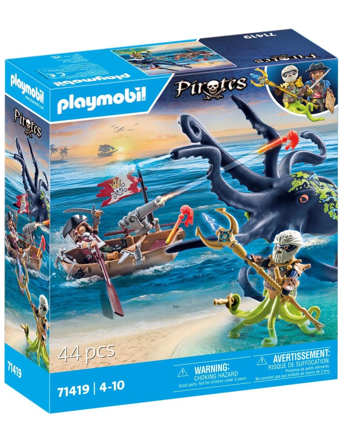 Padrone degli Oceani: Dark Kraken, un polipo umano e capo dei Deepers, brandisce il tridente con una bussola magica. Insieme al mostruoso polipo, combatte fianco a fianco contro il pirata in avvicinamento Vere Battaglie Acquatiche: Il gigantesco polipo scaglia veri spruzzi d'acqua dai suoi tentacoli, una vera sfida per il pirata. Usa accessori come cannoni e proiettili per resistere al mostro marino Il Play set è adatto ai bambini dai 4 anni in su: le dimensioni dei personaggi sono adeguate alle mani dei più piccoli e danno una piacevole sensazione al tatto grazie ai bordi arrotondati Prodotto di alta qualità. Pulizia dei pezzi solo con acqua e senza l'uso di prodotti chimici Set di gioco con 44 pezzi: 2 personaggi PLAYMOBIL, 1 animale, e molti accessori, Materiale in plastica, LxLxH: 24 x 21 x 8 cm, peso: 192 g, Codice articolo 71419