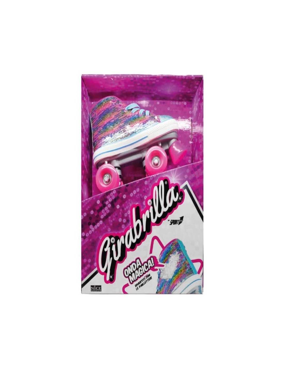 Pattini a rotelle quad modello girabrilla, rivestiti in paillettes multicolor, dotati di cuscinetti abec3. Prodotto di ottima qualità.