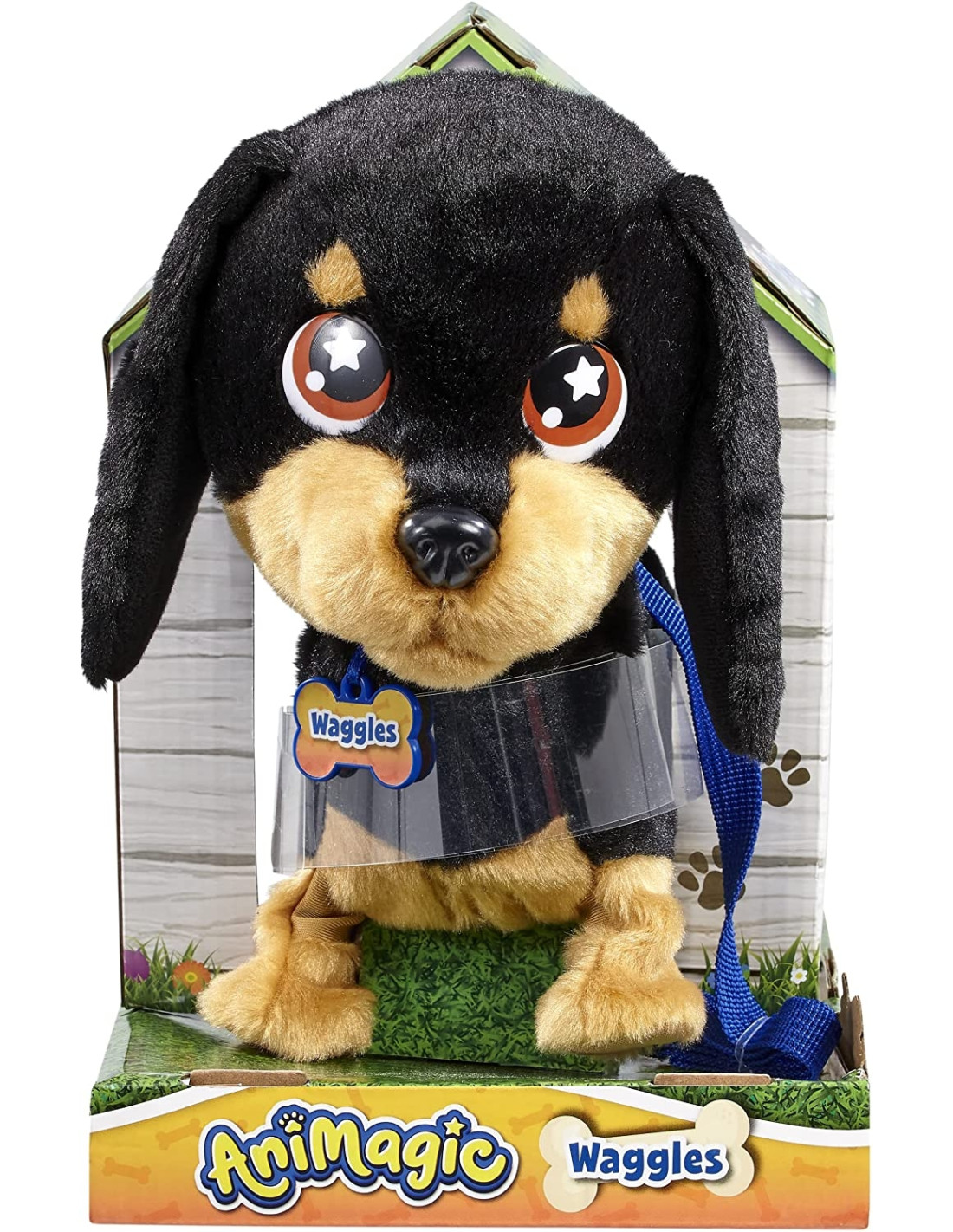 Il peluche Animagic cane Waggles in giro, un peluche interattivo che aspetta solo il vostro bambino per giocare, coccolare, passeggiare e molto altro ancora. Waggles è un adorabile tekel che ama le passeggiate. Accarezzalo per innescare le sue funzioni: cammina, abbassa e muove la coda. Un adorabile cane di peluche che il vostro bambino amerà passeggiare come un vero animale. Funziona con 4 batterie LR06 incluse.