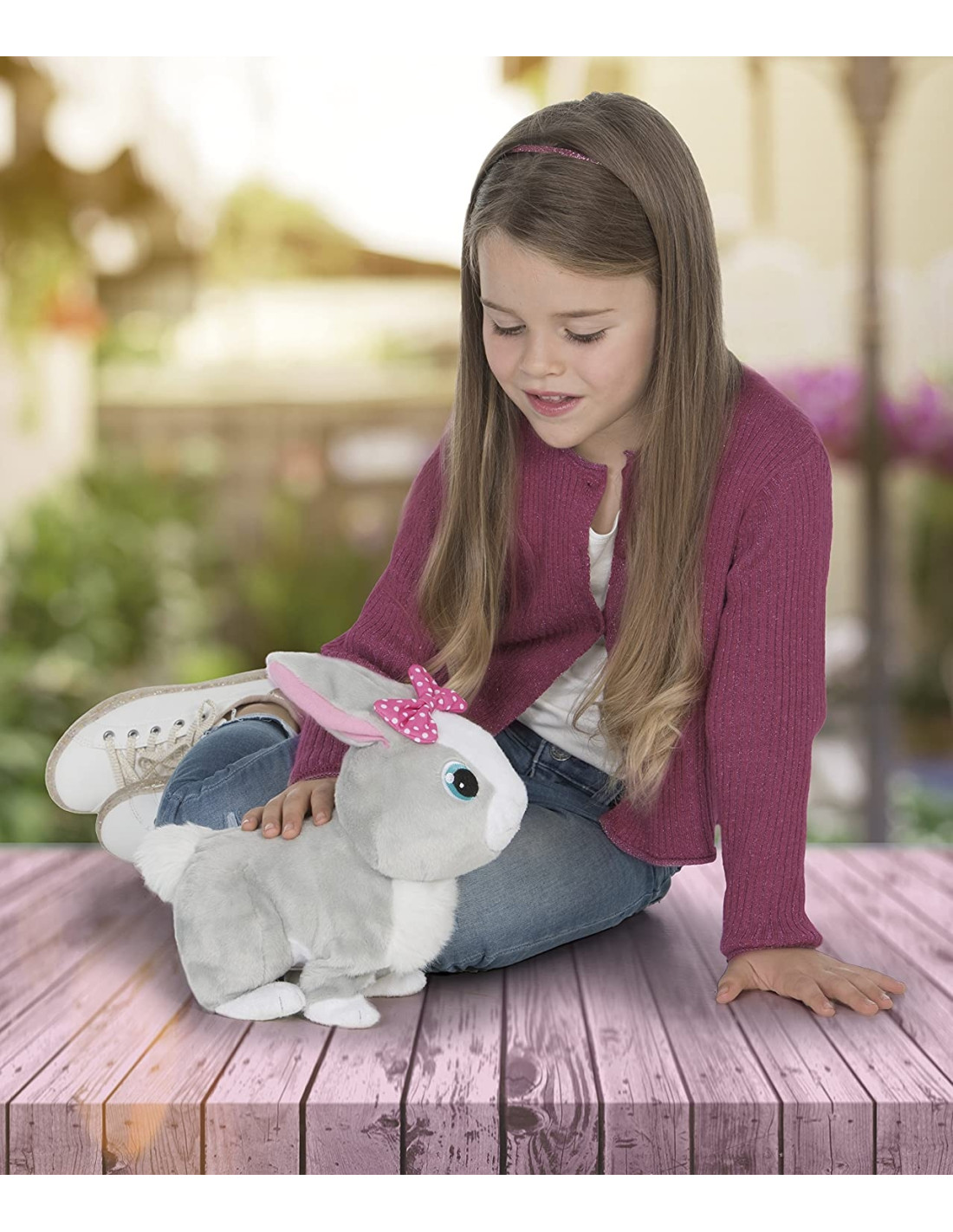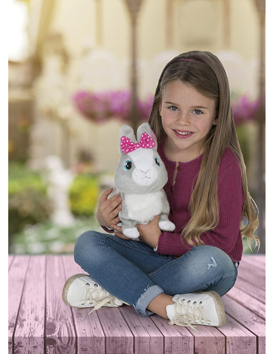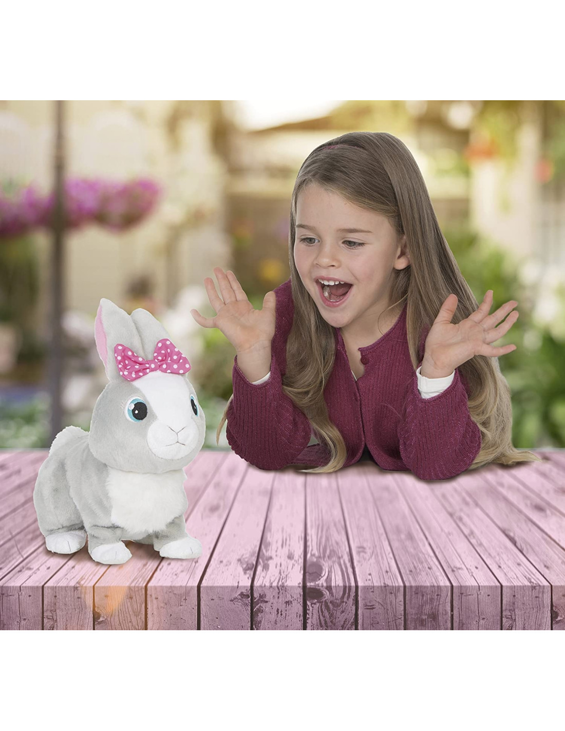 Ti presentiamo Betsy la coniglietta paurosa, un'adorabile coniglietta di peluche con simpatici suoni. Tenera e salterina, adora le carezze. Chiamala dolcemente e comincerà a saltellare. Ma non gridare troppo per non farla spaventare. Muove anche le orecchie come una coniglietta vera. È bellissima e tenerissima con il suo laccetto rosa.