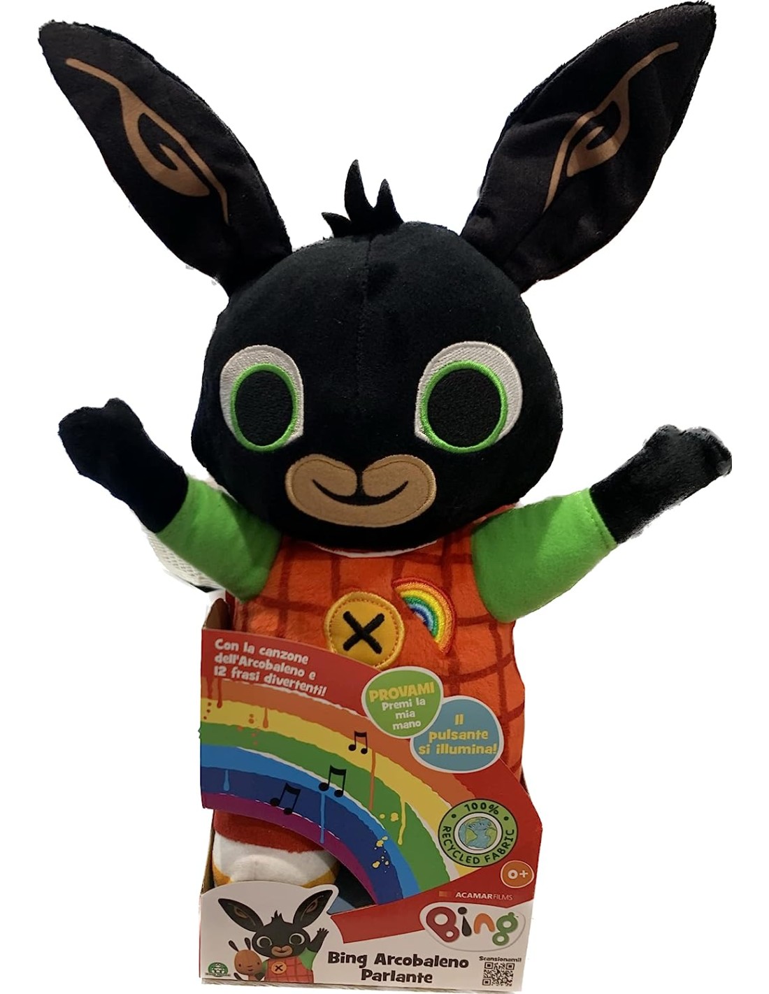 Nuovo peluche parlante di Bing con musica e luci! Quando premi la mano di Bing si attivano numerose frasi, tra cui la famosa canzone Rainbow, canticchiata da Bing. Sempre premendo la mano di Bing si attivano delle luci nel petto di Bing di diversi colori: rosse, blu e verdi Scopri tutte le sue caratteristiche: Simbolo dell'arcobaleno ricamato sulla sua salopette Bottone ricamato e applicato con funzione di illuminazione sul retro Nuova posa di Bing con le braccia in aria Nuovo pack a tema arcobaleno Peluche realizzato con tessuti morbidi e imbottiture riciclate
