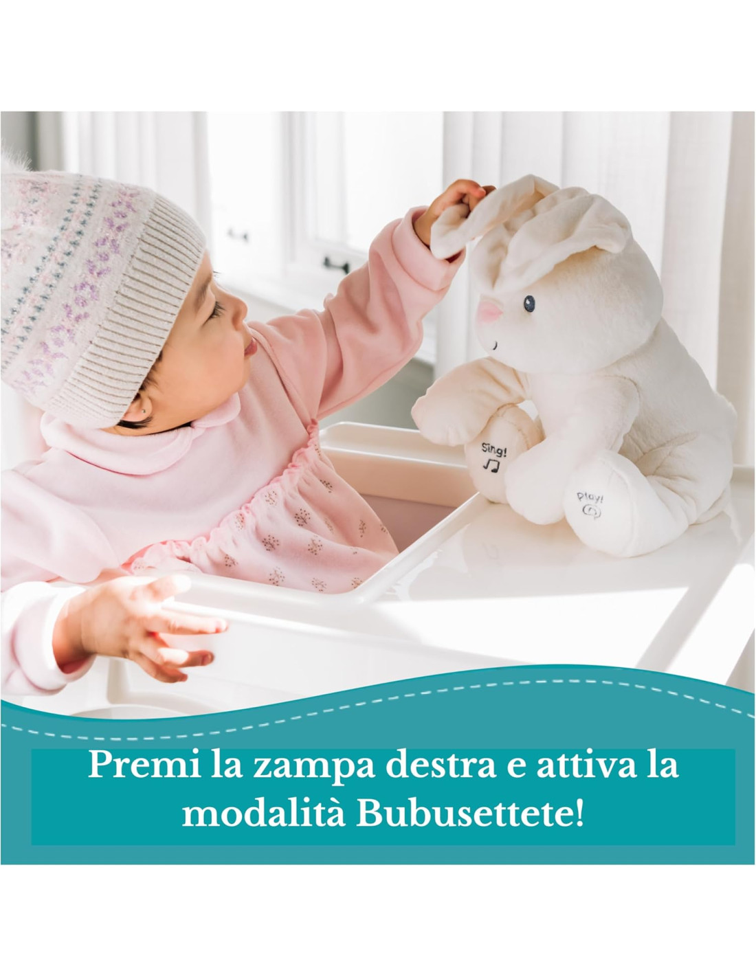 CONIGLIETTA PELUCHE INTERATTIVA: flora interagisce con il bambino con tante frasi divertenti e il gioco del bubu settete, abbassando e rialzando le orecchie davanti agli occhi