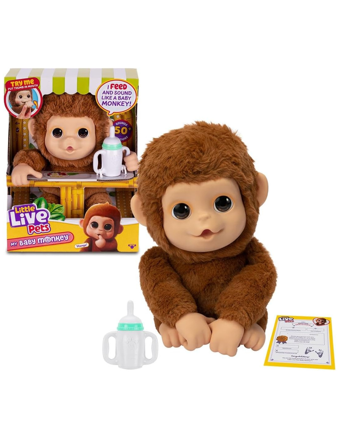 Mango è il nome di questa tenera scimmietta interattiva! Funzioni altamente realistiche: quando gli dai il suo biberon muove la bocca! Con oltre 50 suoni e reazioni, interagisce con te! Adora il solletico e quando gli tocchi il pancino emette suoni gioiosi e versetti divertenti! Dotata di sensori sulla testa e sulla pancia che rendono il gioco ancora più coinvolgente! Grazie alle mani e ai piedi prensili si aggrappa agli oggetti come una scimmietta vera!